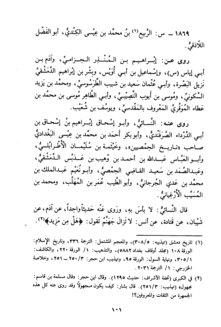 (2) في الكبرى (تحفة الاشراف: حديث 1295) . وَقَال ابن حجر: قال مسلمة بن قاسم: مجهول" (تهذيب: 3 / 251) . قال بشار: كيف يكون مجهولا وقد روى عنه كل هذه الجمهرة من الثقات والمعروفين؟ !
