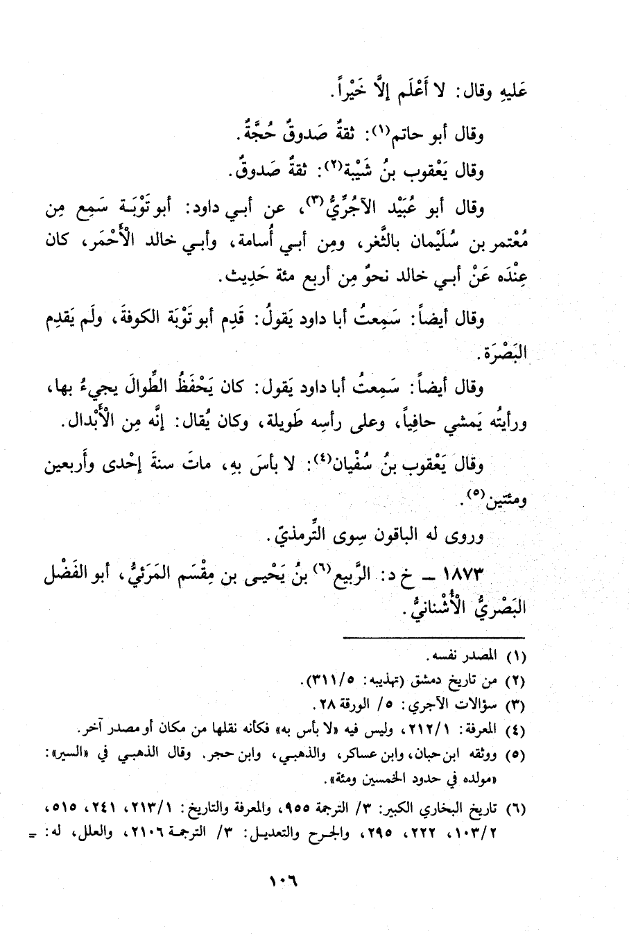 (6) تاريخ البخاري الكبير: 3 / الترجمة 955، والمعرفة والتاريخ: 1 / 213، 241، 515، 2 / 103، 222، 295، والجرح والتعديل: 3 / الترجمة 2106، والعلل، له: =