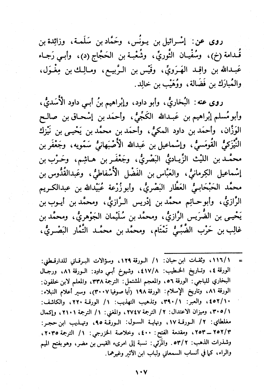 = 1 / 116، وثقات ابن حبان: 1 / الورقة 129، وسؤالات البرقاني للدارقطني: الورقة 4، وتاريخ الخطيب: 8 / 417، وشيوخ أبي داود: الورقة 81، ورجال البخاري للباجي: الورقة 56، والمعجم المشتمل: الترجمة 338، والمعلم لابن خلفون: الورقة 81، وتاريخ الاسلام: الورقة 198 (آيا صوفيا 3007) ، وسير أعلام النبلاء: 10 / 452، والعبر: 1 / 390، وتذهيب التهذيب: 1 / الورقة 220، والكاشف: 1 / 305، وميزان الاعتدال: 2 / الترجمة 2747، والمغني: 1 / الترجمة 2101، وإكمال مغلطاي: 2 / الورقة 17، ونهاية السول: الورقة 95، وتهذيب ابن حجر: 3 / 252 - 253، ومقدمة الفتح: 400، وخلاصة الخزرجي: 1 / الترجمة 2035، وشذرات الذهب: 2 / 53.