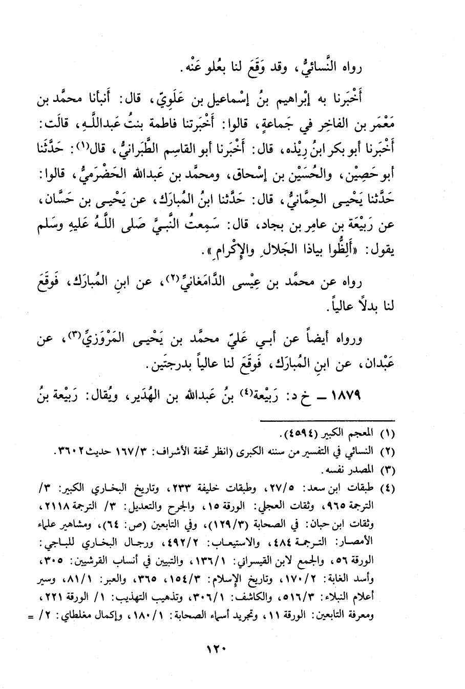 أخبرنا بِهِ إِبْرَاهِيمُ بْنُ إِسْمَاعِيلَ بْنِ عَلَوِيٍّ، قال: أَنْبَأَنَا مُحَمَّدُ بْنُ مَعْمَرِ بْنِ الْفَاخِرِ فِي جَمَاعَةٍ، قَالُوا: أَخْبَرَتْنَا فَاطِمَةُ بِنْتُ عَبد اللَّهِ، قَالَتْ: أخبرنا أَبُو بَكْرِ بْنُ رِيذَةَ، قال: أخبرنا أَبُو الْقَاسِمِ الطَّبَرَانِيُّ، قال (1) : حَدَّثَنَا أَبُو حُصَيْنٍ، والْحُسَيْنُ بْنُ إِسْحَاقَ، ومُحَمَّدُ بْنُ عَبد اللَّهِ الْحَضْرَمِيُّ، قَالُوا: حَدَّثَنَا يَحْيَى الْحَمَّانِيُّ، قال: حَدَّثَنَا ابْنُ الْمُبَارَكِ، عَنْ يَحْيَى بْنِ حَسَّانٍ، عَنْ رَبِيعَةَ بْنِ عَامِرِ بْنِ بَجَادَ، قال: سَمِعْتُ النَّبِيَّ صَلَّى اللَّهُ عليه وسلم يقول: ألظوا بياذا الْجَلالِ والإِكْرَامِ.