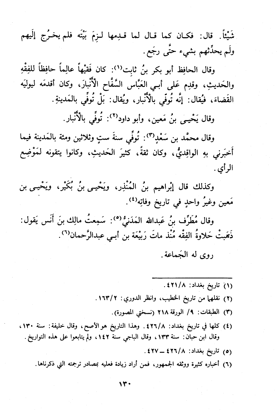 (4) كلها في تاريخ بغداد: 8 / 426. وهذا التاريخ هو الاصح، وَقَال خليفة: سنة 130، وَقَال ابن حبان: سنة 133، وَقَال الباجي سنة 142، ولم يتابعوا على هذه التواريخ.