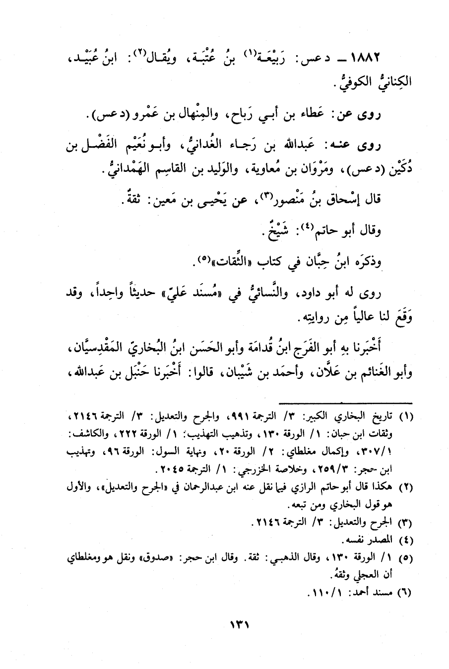 (5) 1 / الورقة 130، وَقَال الذهبي: ثقة. وَقَال ابن حجر: صدوق"ونقل هو ومغلطاي أن العجلي وثقه.