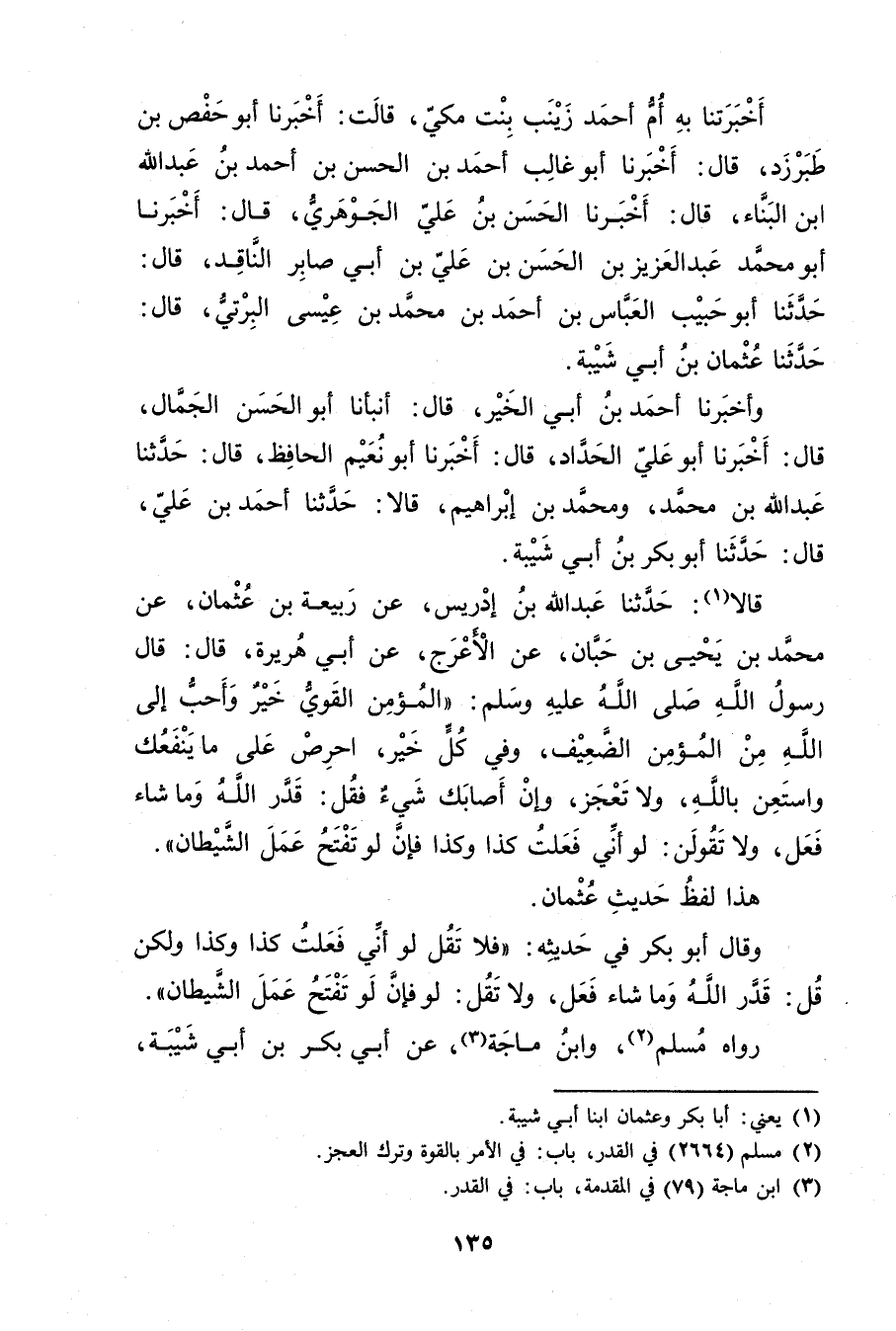 قَالا (1) : حَدَّثَنَا عَبد اللَّهِ بْنِ إِدْرِيسَ، عن رَبِيعَةَ بْنِ عُثْمَانَ، عَنْ مُحمد بْنِ يَحيى بْنِ حَبَّان، عَنِ الأَعْرَجِ، عَن أَبِي هُرَيْرة، قال: قال رَسُولُ اللَّهِ صلى الله عَلَيْهِ وسَلَّمَ: الْمُؤْمِنُ الْقَوِيُّ خَيْرٌ وأَحَبُّ إِلَى اللَّهِ مِنَ الْمُؤْمِنِ الضَّعِيفِ، وفِي كُلٍّ خَيْرٌ، احْرِصْ عَلَى مَا يَنْفَعُكَ واسْتَعِنْ بِاللَّهِ، ولا تَعْجَزْ، وإِنْ أَصَابَكَ شَيْءٌ فَقُلْ: قَدَّرَ اللَّهُ ومَا شَاءَ فَعَلَ، ولا تَقُوُلَنَّ: لَوْ أَنِّي فَعَلْتُ كَذَا وكَذَا فَإِنَّ لَوْ تفتح عمل الشيطان.