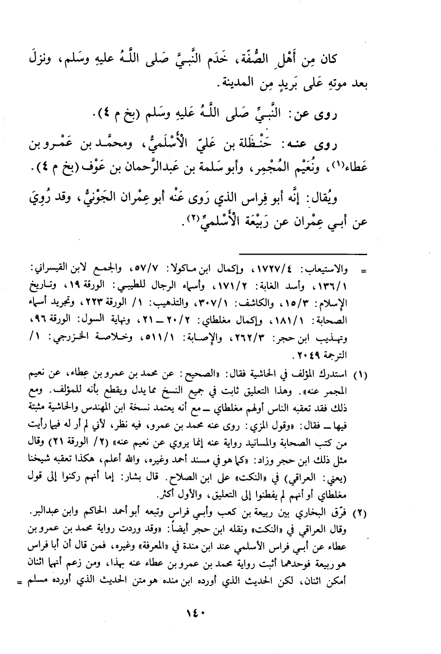 (2) فرق البخاري بين ربيعة بن كعب وأبي فراس وتبعه أبو أحمد الحاكم وابن عَبد الْبَرِّ. وَقَال العراقي في "النكت"ونقله ابن حجر أيضا: وقد وردت رواية محمد بن عَمْرو بن عطاء عَن أبي فراس الأَسلميّ عند ابن مندة في "المعرفة"وغيره، فمن قال أن أبا فراس هو ربيعة فوحدهما أثبت رواية محمد بن عَمْرو بن عطاء عنه بهذا، ومن زعم أنهما اثنان أمكن اثنان، لكن الحديث الذي أورده ابن منده هو متن الحديث الذي أورده مسلم =