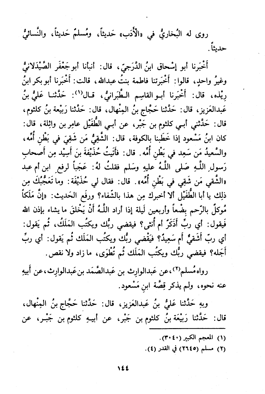 أخبرنا أَبُو إِسْحَاقَ ابْنُ الدَّرَجِيِّ، قال: أَنْبَأَنَا أَبُو جَعْفَرٍ الصَّيْدَلانِيُّ وغَيْرُ واحِدٍ، قَالُوا: أَخْبَرَتْنا فَاطِمَةُ بِنْتُ عَبد اللَّهِ، قَالَتْ: أخبرنا أَبُو بَكْرِ بْنِ رِيذَةَ، قال: أخبرنا أَبُو القاسم الطَّبَرَانِيّ، قال (1) : حَدَّثَنَا علي بْنُ عَبْدِ الْعَزِيزِ، قال: حَدَّثَنَا حَجَّاجُ بْنُ الْمِنْهَالِ، قال: حَدَّثَنَا رَبِيعَةُ بْنُ كُلْثُومٍ، قال: حَدَّثني أَبِي كُلْثُومِ بْنِ جَبْرٍ، عَن أبي الطفيل عامر بن واثلة، قال: كَانَ ابْنُ مَسْعُودٍ إِذَا خَطَبَنَا بِالْكُوفَةِ، قال: الشَّقِيُّ مَنْ شَقِيَ فِي بَطْنِ أُمِّهِ، والسَعِيد مَنْ سَعِدَ فِي بَطْنِ أُمِّهِ. قال: فَأَتَيْتُ حُذَيْفَةَ بْنِ أُسَيْدٍ من أصحاب رَسُول اللَّهِ صَلَّى اللَّهُ عَلَيْهِ وسَلَّمَ فَقُلْتُ له: عَجَبًا لِرَفْعِ ابْنِ أُمِّ عَبْدٍ"الشَّقِيُّ مَنْ شَقِيَ فِي بَطْنِ أُمِّهِ". قال: فَقَالَ لِي حُذَيْفَةُ: ومَا تَعَجُّبُكَ مِنْ ذَلِكَ يَا أَبَا الطُّفَيْلِ أَلا أُخْبِرُكَ مِنْ هَذَا بِالشِّفَاءِ؟ ورَفَعَ الْحَدِيثَ: أَنَّ مَلَكًا مُوَكَّلٌ بِالرَّحِمِ بِضْعًا وأَرْبَعِينَ لَيْلَةً إِذَا أَرَادَ اللَّهُ أَنْ يَخْلُقَ مَا يَشَاءُ بِإِذْنِ اللَّهِ فَيَقُولُ: أَيْ رَبِّ أَذَكَرٌ أَمْ أُنْثَى؟ فَيَقْضِي رَبُّكَ ويَكْتُبُ الْمَلَكُ، ثُمَّ يَقُولُ: أَيْ رَبِّ أَشَقِيٌّ أَمْ سَعِيد؟ فَيَقْضِي رَبُّكَ ويَكْتُبُ الْمَلَكُ ثُمَّ يَقُولُ: أَيْ رَبِّ أَجَلُهُ؟ فَيَقْضِي رَبُّكَ ويَكْتُبُ الْمَلَكُ ثُمَّ تُطْوَى، مَا زَادَ ولا نَقَصَ.