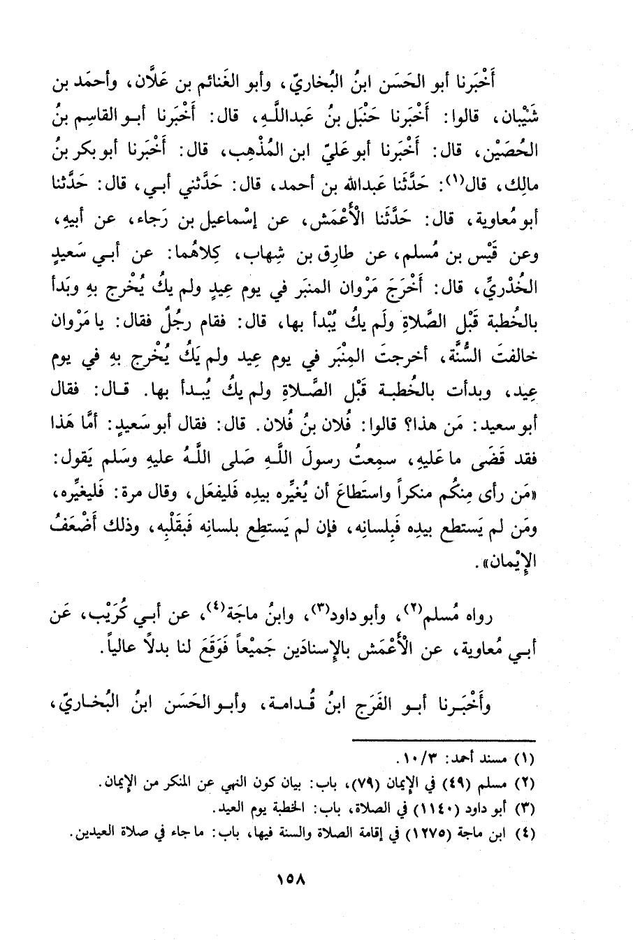 أَخْبَرَنَا أَبُو الْحَسَنِ بْنُ الْبُخَارِيِّ، وأبو الغنائم بْن علان، وأحمد بْنُ شَيْبَانَ، قَالُوا: أَخْبَرَنَا حَنْبَلُ بْن عَبد الله، قال: أَخْبَرَنَا أبو القاسم بْن الحصين، قال: أَخْبَرَنَا أَبُو عَلِيِّ ابْنُ الْمُذْهِب، قال: أَخْبَرَنَا أبو بكر بْن مالك، قال (1) : حَدَّثَنَا عَبد الله بْن أَحْمَدَ، قال: حَدَّثني أبي، قال: حَدَّثَنَا أَبُو مُعَاوِيَةَ، قال: حَدَّثَنَا الأَعْمَشُ، عَنْ إِسْمَاعِيلَ بْنِ رَجَاءٍ، عَن أَبِيهِ، وعَنْ قَيْسِ بْن مسلم، عن طارق بْن شِهَابٍ، كِلاهُمَا: عَن أَبِي سَعِيد الخُدْرِيّ، قال: أَخْرَجَ مَرْوَانُ الْمِنْبَرَ فِي يَوْمِ عِيدٍ ولَمْ يَكُ يَخْرُجُ بِهِ وبَدَأَ بِالْخُطْبَةِ قَبْلَ الصَّلاةِ ولَمْ يَكُ يَبْدَأُ بِهَا، قال: فَقَامَ رَجُلٌ فَقَالَ: يَا مَرْوَانُ خَالَفْتَ السُّنَّةَ، أَخْرَجْتَ الْمِنْبَرَ فِي يَوْمِ عِيدٍ ولَمْ يَكُ يُخْرَجُ بِهِ فِي يَوْمِ عِيدٍ، وبَدَأَتَ بِالْخُطْبَةِ قَبْلَ الصَّلاةِ ولَمْ يَكُ يُبْدَأُ بِهَا. قال: فَقَالَ أَبُو سَعِيد: مَنْ هَذَا؟ قَالُوا: فُلانُ بْنُ فُلانٍ. قال: فَقَالَ أَبُو سَعِيد: أَمَّا هَذَا فَقَدْ قضى ما عليه، سمعت رَسُول اللَّهِ صَلَّى اللَّهُ عَلَيْهِ وسَلَّمَ يَقُولُ: مَنْ رَأَى مِنْكُمْ مُنْكَرًا واسْتَطَاعَ أَنْ يُغَيِّرَهُ بِيَدِهِ فَلْيَفْعَلْ، وَقَال مَرَّةً: فَلْيُغَيِّرْهُ، ومَنْ لَمْ يَسْتَطِعْ بِيَدِهِ فِبِلِسَانِهِ، فَإِنْ لَمْ يَسْتَطِعْ بِلِسَانِهِ فِبِقَلْبِهِ، وذَلِكَ أَضْعَفُ الإِيمَانِ.