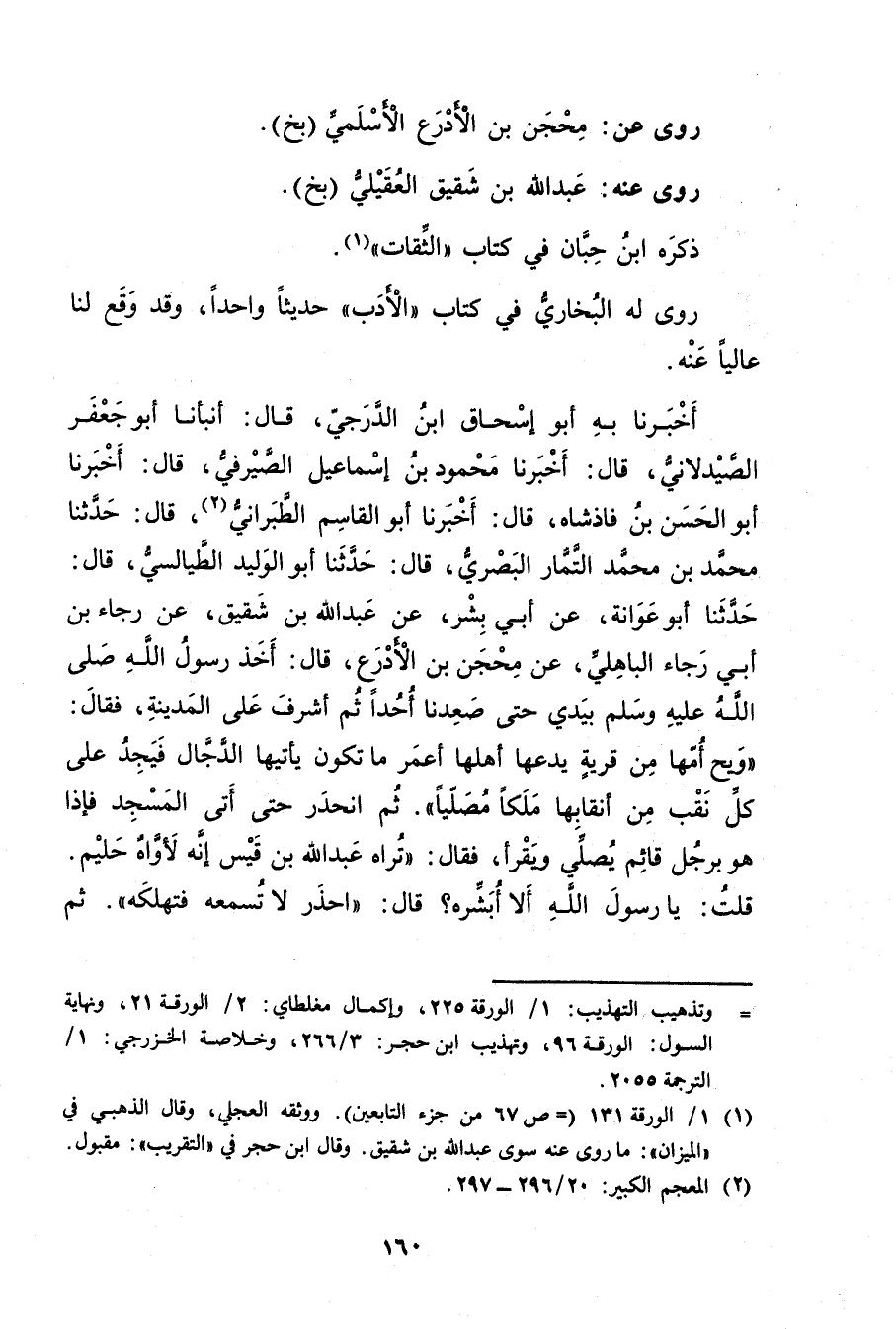 أَخْبَرَنَا بِهِ أَبُو إِسْحَاقَ ابْنُ الدَّرَجِيِّ، قال: أنبأنا أَبُو جَعْفَرٍ الصَّيْدَلانِيُّ، قال: أَخْبَرَنَا مَحْمُودُ بْنُ إِسْمَاعِيلَ الصَّيْرَفِيُّ، قال: أَخْبَرَنَا أَبُو الْحَسَنِ بْنِ فَاذْشْاهِ، قال: أخبرنا أَبُو الْقَاسِمِ الطَّبَرَانِيُّ (2) ، قال: حَدَّثَنَا مُحَمَّدُ بْنُ مُحَمَّدٍ التَّمَّارُ البَصْرِيّ، قال: حَدَّثَنَا أبو الوليد الطيالسي، قال: حَدَّثَنَا أَبُو عَوَانَةَ، عَن أَبِي بشر، عن عَبد الله بْن شَقِيقٍ، عَنْ رَجَاءِ بْنِ أَبي رَجَاءٍ الْبَاهِلِيِّ، عَنْ مِحْجَنِ بْنِ الأَدْرَعِ، قال: أَخَذَ رَسُولُ اللَّهِ صَلَّى اللَّهُ عَلَيْهِ وسَلَّمَ بِيَدِي حَتَّى صَعَدْنَا أُحُدًا ثُمَّ أَشْرَفَ عَلَى الْمَدِينَةِ، فَقَالَ: ويْحَ أُمِّهَا مِنْ قَرْيَةٍ يَدَعُهَا أَهْلُهَا أعُمَر مَا تَكُونُ يَأْتِيهَا الدَّجَّالُ فَيَجِدْ عَلَى كَلِّ نَقَبٍ مِنْ أَنْقَابِهَا مَلَكًا مُصَلِّيًا". ثُمَّ انْحَدَرَ حَتَّى أَتَى الْمَسْجِدَ فَإِذَا هُوَ بِرَجُلٍ قَائِمٍ يُصَلِّي ويَقْرَأُ، فَقَالَ: تُرَاهُ عَبد اللَّهِ بْنَ قَيْسٍ إِنَّهُ لأَوَّاهٌ حَلِيمٌ. قُلْتُ: يَا رَسُولَ اللَّهِ أَلا أُبَشِّرَهُ؟ قال: احْذَرْ لا تسمعه فتهلكه". ثم