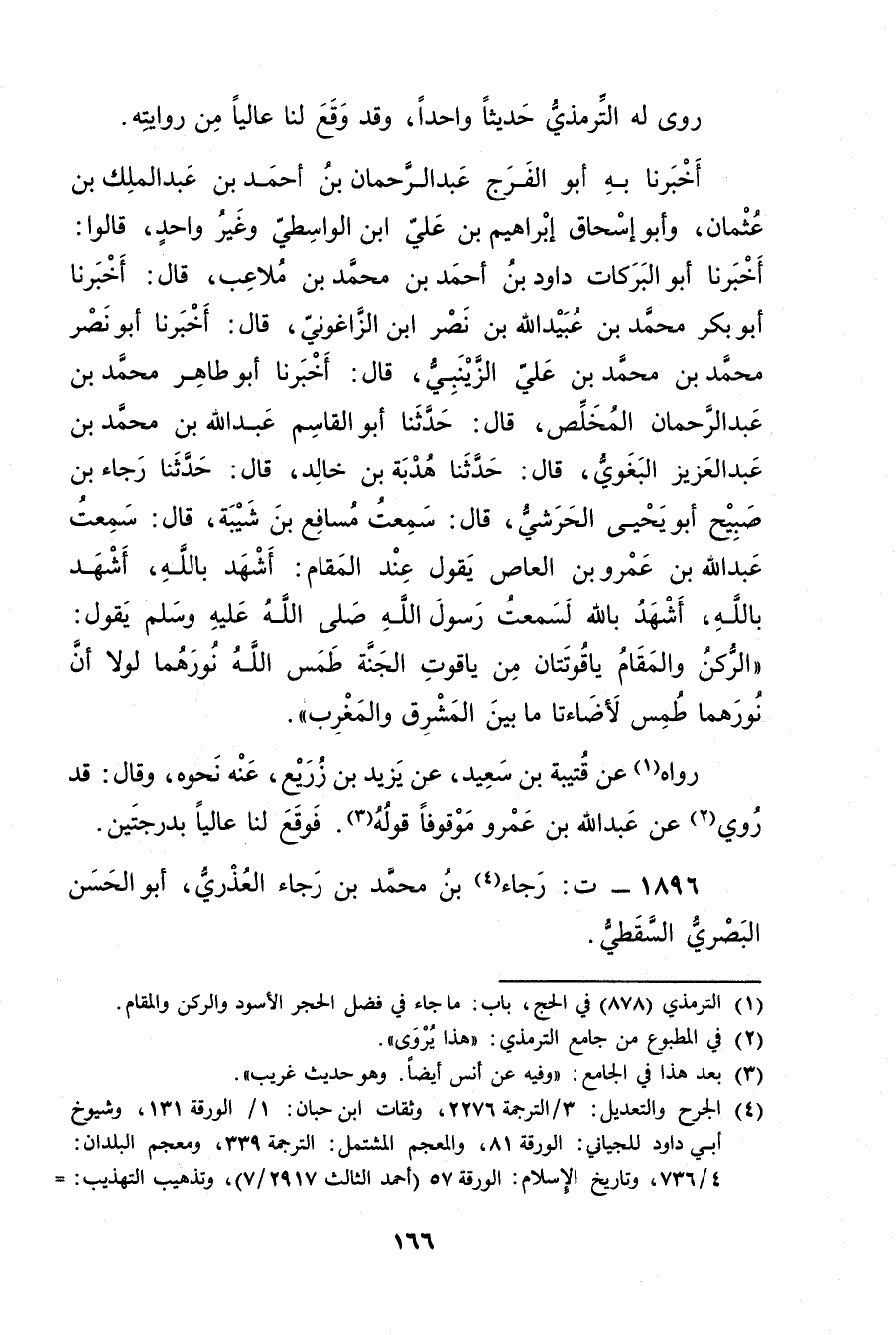أَخْبَرَنَا بِهِ أَبُو الْفَرَجِ عَبْد الرَّحْمَنِ بْن أَحْمَد بْن عَبد المَلِك بْن عثمان، وأبو إسحاق إبراهيم بن علي ابن الْوَاسِطِيِّ وغَيْرُ واحِدٍ، قَالُوا: أخبرنا أَبُو الْبَرَكَاتِ دَاوُدُ بْنُ أَحْمَدَ بْن مُحَمَّد بْن ملاعب، قال: أَخْبَرَنَا أَبُو نَصْرٍ مُحَمَّدُ بْنُ مُحَمَّدِ بْنِ عَلِيٍّ الزَّيْنَبِيُّ، قال: أَخْبَرَنَا أَبُو طَاهِرٍ مُحَمَّدُ بْنُ عَبْدِ الرَّحْمَنِ المخلص، قال: حَدَّثَنَا أَبُو الْقَاسِم عَبد اللَّهِ بْن مُحَمَّد بْن عَبْد الْعَزِيزِ البغوي، قال: حَدَّثَنَا هدبة بْن خالد، قال: حَدَّثَنَا رَجَاءُ بْنُ صُبَيْحٍ أبويحيى الْحَرَشِيُّ، قال: سَمِعْتُ مُسَافِعَ بْنَ شَيْبَة، قال: سَمِعْتُ عَبد اللَّهِ بْنَ عَمْرو بْنِ الْعَاصِ يَقُولُ عِنْدَ الْمَقَامِ: أَشْهَدُ بِاللَّهِ، أَشْهَدُ بِاللَّهِ، أَشْهَدُ بِاللَّهِ لَسَمِعْتُ رَسُولَ اللَّهِ صلى الله عليه وسلم يَقُولُ: الرُّكْنُ والْمَقَامُ يَاقُوتَتَانِ مِنْ يَاقُوتِ الْجَنَّةِ طَمَسَ اللَّهُ نُورَهُمَا لَوْلا أَنَّ نُورَهُمَا طُمِسَ لأَضَاءَتَا مَا بَيْنَ الْمَشْرِقِ والْمَغْرِبِ.