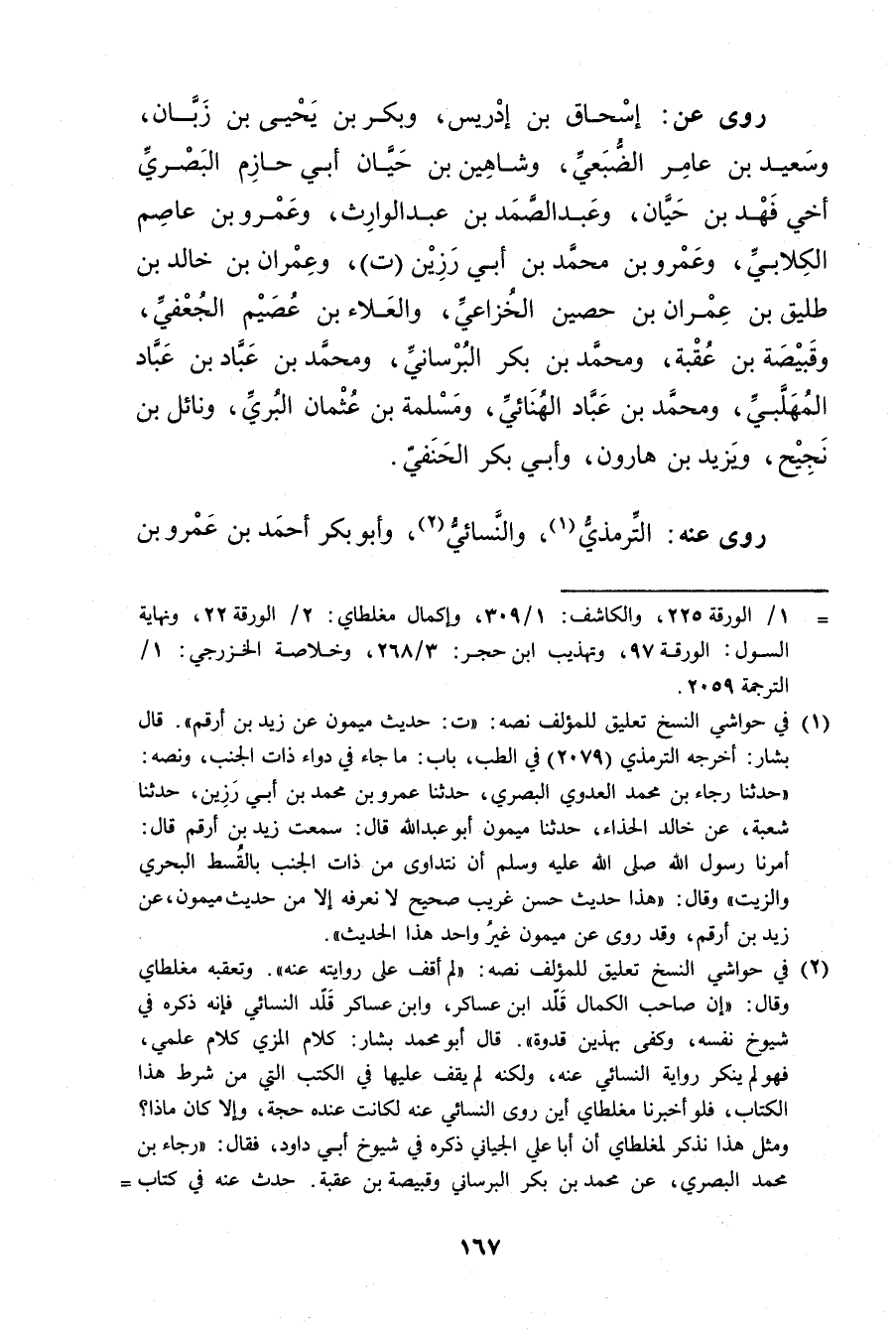 (1) في حواشي النسخ تعليق للمؤلف نصه: ت: حديث ميمون عَنْ زَيْدِ بْنِ أَرْقَمَ". قال بشار: أخرجه التِّرْمِذِيّ (2079) في الطب، باب: ما جاء في دواء ذات الجنب، ونصه: حَدَّثَنَا رجاء بن محمد العدوي البَصْرِيّ، حَدَّثَنَا عَمْرو بْنُ مُحَمَّدِ بْنِ أَبي رزين، حَدَّثَنَا شعبة، عن خالد الحذاء، حَدَّثَنَا مَيْمُونٌ أَبُو عَبْدِ اللَّهِ قال: سَمِعْتُ زَيْدَ بْنَ أَرْقَمَ قال: أمرنا وسول اللَّهِ صلى الله عليه وسلم أن نتداوى من ذات الجنب بالقسط البحري والزيت"وَقَال: هذا حديث حسن غريب صحيح لا نعرفه إلا من حديث ميمون، عن زيد بن أرقم، وقد روى عن ميمون غير واحد هذا الحديث.
