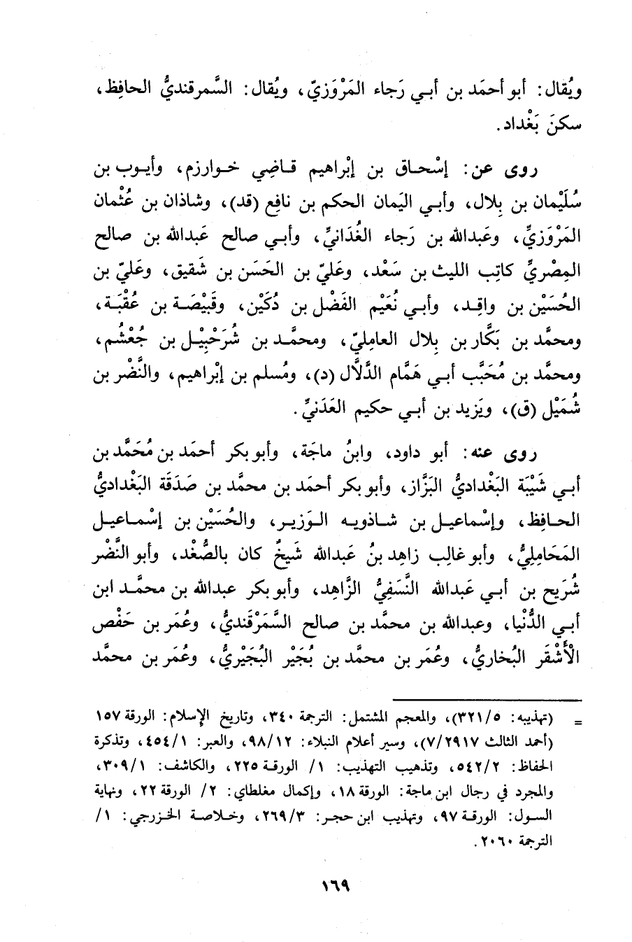 = (تهذيبه: 5 / 321) ، والمعجم المشتمل: الترجمة 340، وتاريخ الاسلام: الورقة 157 (أحمد الثالث 2917 / 7) ، وسير أعلام النبلاء: 12 / 98، والعبر: 1 / 454، وتذكرة الحفاظ: 2 / 542، وتذهيب التهذيب: 1 / الورقة 225، والكاشف: 1 / 309، والمجرد في رجال ابن ماجة: الورقة 18، وإكمال مغلطاي: 2 / الورقة 22، ونهاية السول: الورقة 97، وتهذيب ابن حجر: 3 / 269، وخلاصة الخزرجي: 1 / الترجمة 2060.