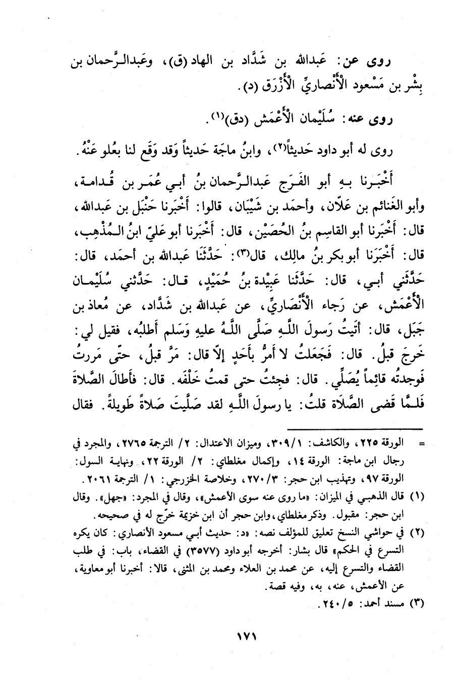 أَخْبَرَنَا به أَبُو الفرج عَبْدُ الرَّحْمَنِ بْنُ أَبي عُمَر بْنُ قُدَامَةَ، وأَبُو الْغَنَائِمِ بْنُ عَلانَ، وأَحْمَدُ بْنُ شَيْبَانَ، قَالُوا: أَخْبَرَنَا حنبل بْن عَبد الله، قال: أَخْبَرَنَا أبو القاسم بْن الحصين، قال: أَخْبَرَنَا أبو علي ابْنُ الْمُذْهِب، قال: أَخْبَرَنَا أَبُو بكر بن مالك، قال (3) : حذثنا عَبد اللَّهِ بْن أَحْمَدَ، قال: حَدَّثني أَبِي، قال: حَدَّثَنَا عُبَيدة بْنُ حُمَيْدٍ، قال: حَدَّثَنِي سُلَيْمان الأَعْمَشُ، عَنْ رَجَاءٍ الأَنْصارِيّ، عَنْ عَبد الله بْن شداد، عَن مُعَاذِ بْنِ جَبَلٍ، قال: أَتَيْتُ رَسُول اللَّهِ صلى الله عليه وسَلَّمَ أَطْلُبُهُ، فَقِيلَ لِي: خَرَجَ قَبْلُ. قال: فَجَعَلْتُ لا أَمُرُّ بِأَحَدٍ إِلا قال: مَرَّ قَبْلُ، حَتَّى مَرَرْتُ فَوَجَدْتُهُ قَائِمًا يُصَلِّي. قال: فَجِئْتُ حَتَّى قُمْتُ خَلْفَهُ. قال: فَأَطَالَ الصَّلاةَ فَلَمَّا قَضَى الصَّلاةَ قُلْتُ: يَا رَسُولَ اللَّهِ لَقَدْ صَلَّيْتَ صَلاةً طَوِيلَةً. فَقَالَ
