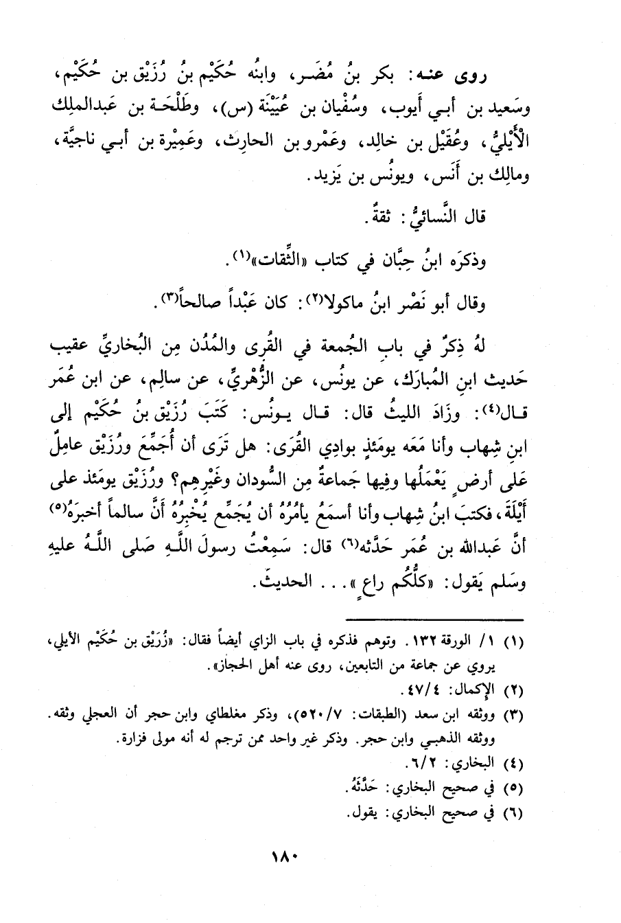 له ذكر في باب الجمعة في القرى والمدن من البخاري عقيب حديث ابْن المبارك، عن يونس، عن الزُّهْرِيّ، عن سالم، عن ابْن عُمَر قال (4) : وزاد الليث قال: قال يونس: كتب رزيق بْن حكيم إلى ابْن شهاب وأنا معه يومئذ بوداي القرى: هل ترى أن أجمع ورزيق عامل على أرض يعملها وفيها جماعة من السودان وغيرهم؟ ورزيق يومئذ على أيلة، فكتب ابْن شهاب وأنا أسمع يأمره أن يجمع يخبره أن سالما أَخْبَرَهُ (5) أَنَّ عَبد اللَّهِ بْنَ عُمَر حدثه (6) قال: سمعت رسول اللَّهِ صلى الله عليه وسلم يقول: كلكم راع" ... الحديث.