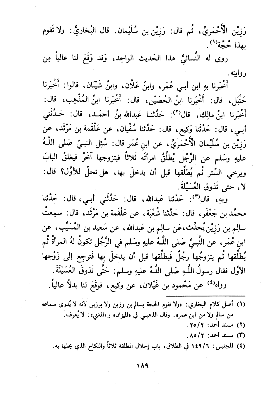 أخبرنا بِهِ ابْنُ أَبي عُمَر، وابْنُ عَلانَ، وابْنُ شَيْبَانَ، قَالُوا: أخبرنا حنبل، قال: أخبرنا ابْنُ الْحُصَيْنِ، قال: أخبرنا ابْنُ الْمُذْهِب، قال: أخبرنا ابْن مالك، قال (2) : حَدَّثَنَا عَبد اللَّهِ بْن أَحْمَدَ، قال: حَدَّثني أبي، قال: حَدَّثَنَا وكِيعٌ، قال: حَدَّثَنَا سُفْيَانُ، عَنْ عَلْقَمَةَ بْنِ مَرْثَدٍ، عَنِ رَزِينِ بْنِ سُلَيْمان الأَحْمَرِيِّ، عَنِ ابْنِ عُمَر قال: سُئِلَ النَّبِيُّ صَلَّى اللَّهُ عَلَيْهِ وسَلَّمَ عَن الرجل يطلق امرأته ثلاثا فيتزوجها أخَرُ فَيُغْلِقُ الْبَابَ ويُرْخِي السِّتْرَ ثُمَّ يُطَلِّقُهَا قَبْلَ أَنْ يَدْخُلَ بِهَا، هَلْ تَحِلُّ لِلأَوَّلِ؟ قال: لا، حَتَّى تَذُوقَ الْعُسَيْلَةَ.