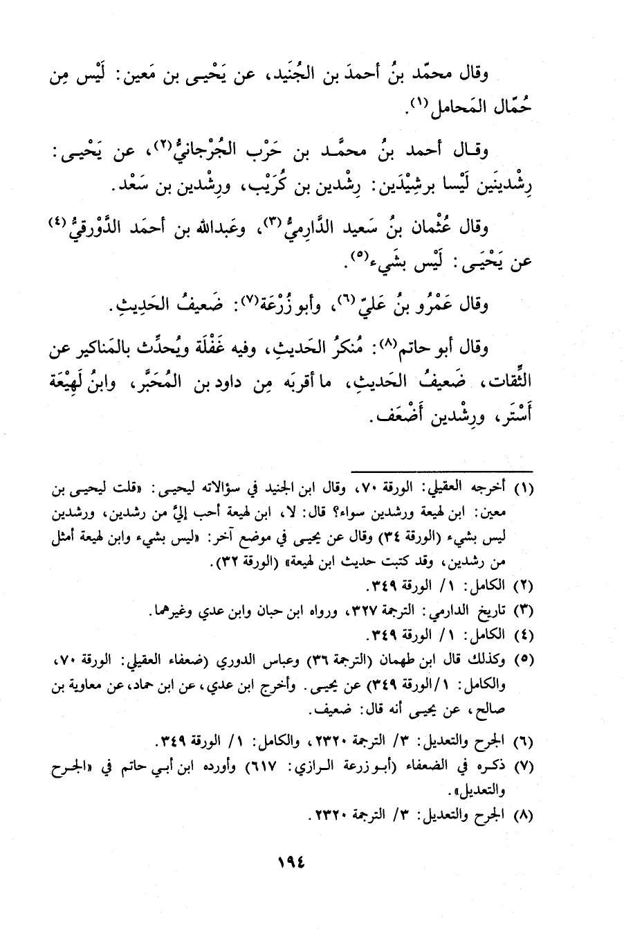 (1) أخرجه العقيلي: الورقة 70، وَقَال ابن الجنيد في سؤالاته ليحيى: قُلْت ليحيى بْن مَعِين: ابْن لَهِيعَة ورشدين سواء؟ قال: لا، ابن لَهِيعَة أحب إلي من رشدين، ورشدين ليس بشيءٍ (الورقة 34) وَقَال عَنْ يَحْيَى فِي موضع آخر: لَيْسَ بشيءٍ وابن لَهِيعَة أمثل من رشدين، وقد كتبت حديث ابن لَهِيعَة" (الورقة 32) .