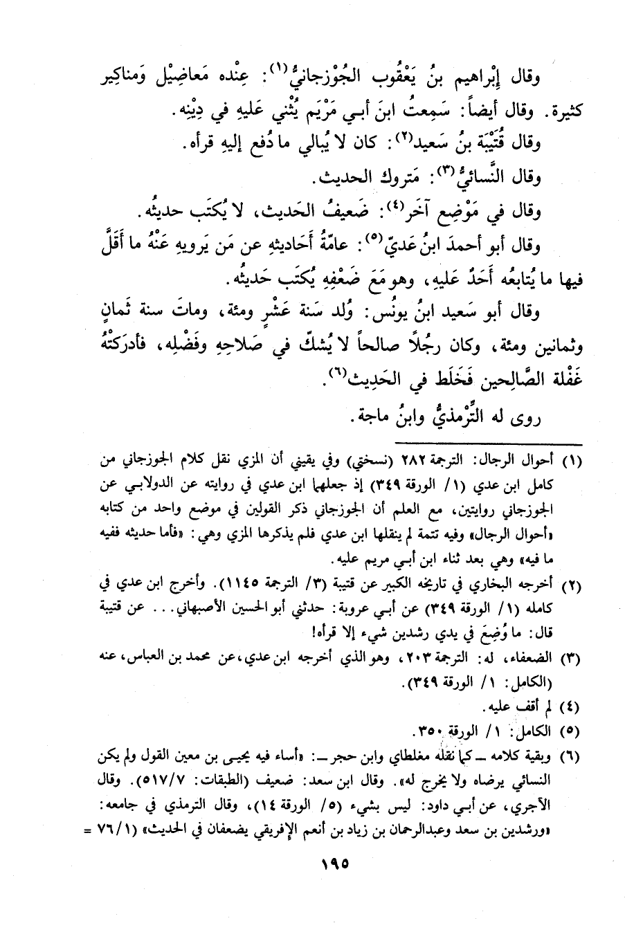 (1) أحوال الرجال: الترجمة 282 (نسختي) وفي يقيني أن المزي نقل كلام الجوزجاني من كامل ابن عدي (1 / الورقة 349) إذ جعلهما ابن عدي في روايته عن الدولابي عن الجوزجاني روايتين، مع العلم أن الجوزجاني ذكر القولين في موضع واحد من كتابه"أحوال الرجال"وفيه تتمة لم ينقلها ابن عدي فلم يذكرها المزي وهي: فأما حديثه ففيه ما فيه"وهي بعد ثناء ابن أَبي مريم عليه.