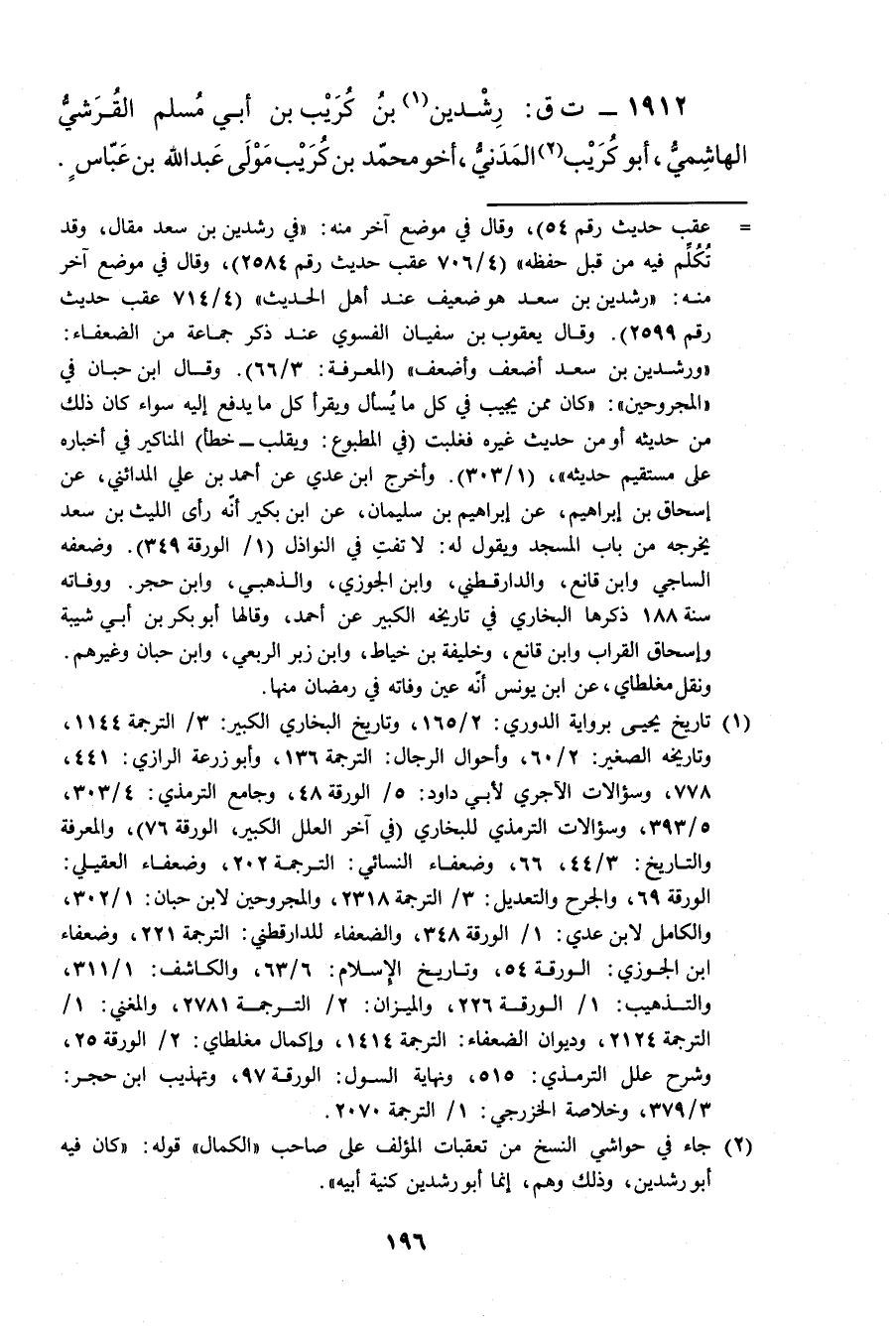 1912 - ت ق: رشدين بن كريب بن أَبي مسلم القرشي الهاشمي (1) ، أبو كريب (2) المدني، أخو مُحَمَّد بْن كريب مولى عَبد الله بن عباس.