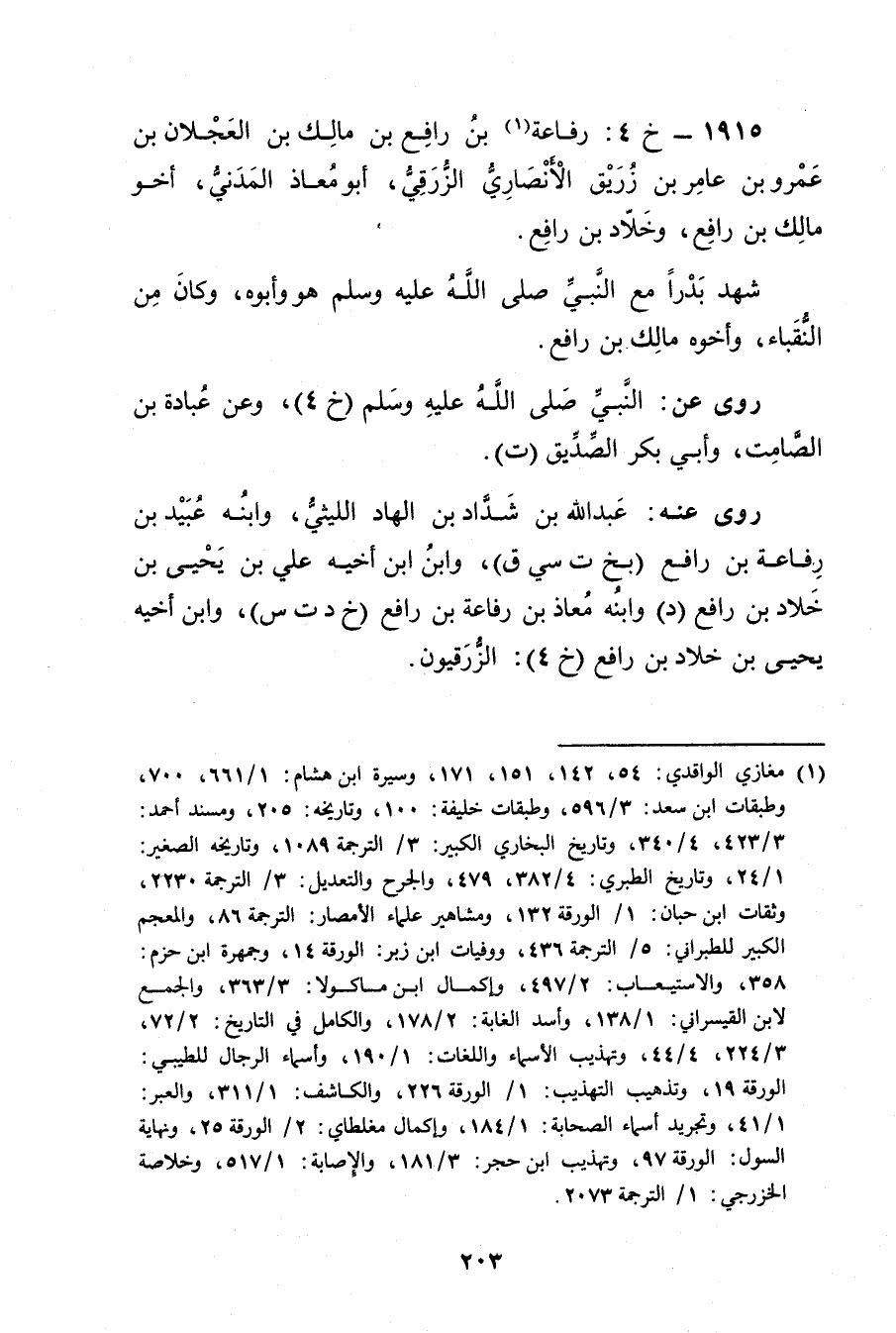 1915 - خ 4: رفاعة بن رافع بن مالك بن العجلان بن عَمْرو بن عامر بن زريق الأَنْصارِيّ الزرقي (1) ، أبو معاذ المدني، أخو مالك بْن رافع، وخلاد بْن رافع.