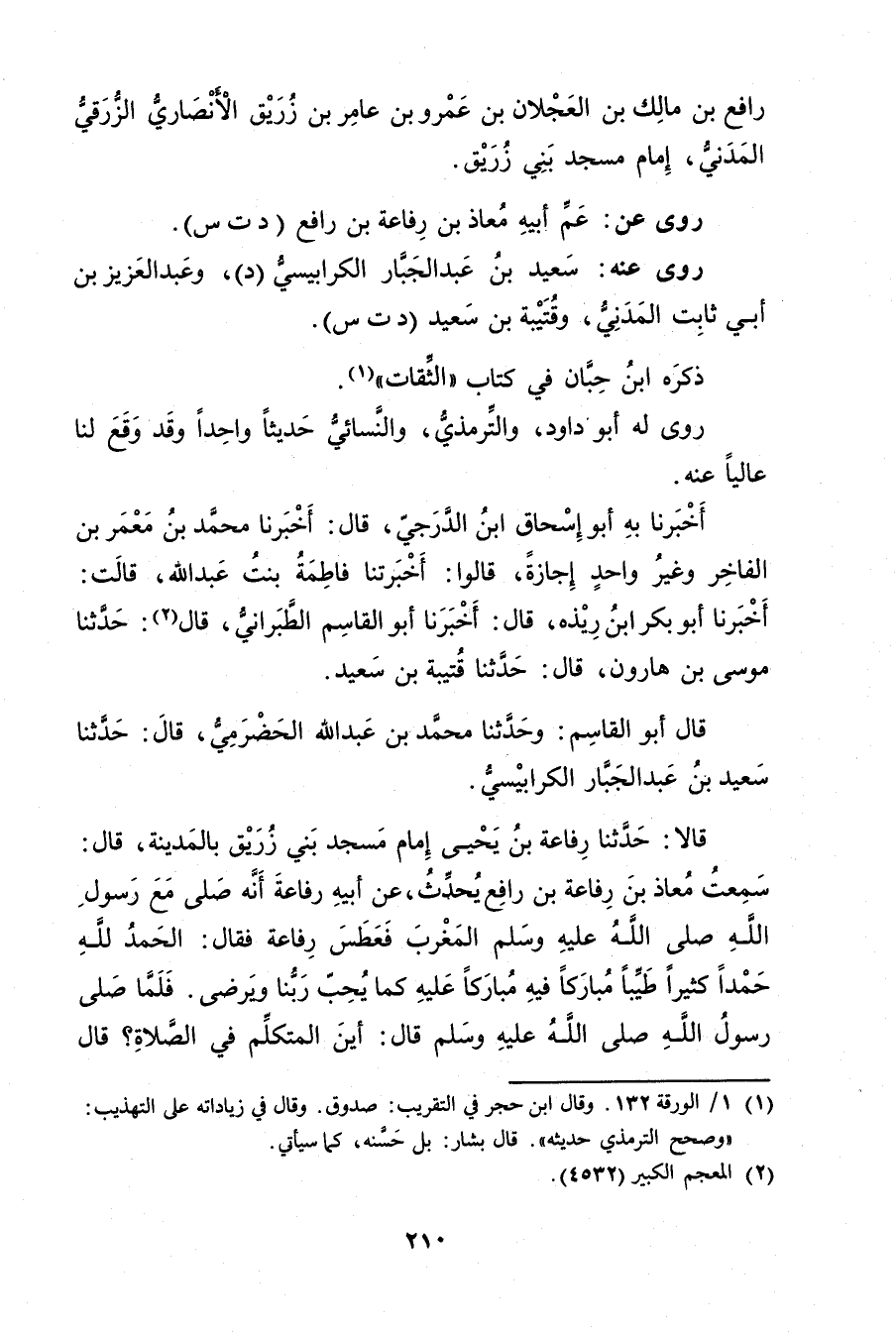 قَالا: حَدَّثَنَا رِفَاعَةُ بْنُ يَحْيَى إِمَامُ مَسْجِدِ بَنِي زُرَيْقٍ بِالْمَدِينَةِ، قال: سَمِعْتُ معاذ بْن رفاعة بْن رافع يُحَدِّثُ، عَن أَبِيهِ رِفَاعَةَ أَنَّهُ صلى مع رَسُول اللَّهِ صَلَّى اللَّهُ عَلَيْهِ وسَلَّمَ الْمَغْرِبَ فَعَطَسَ رِفَاعَةُ فَقَالَ: الْحَمْدُ للهِ حَمْدًا كَثِيرًا طَيِّبًا مُبَارَكًا فِيهِ مُبَارَكًا عَلَيْهِ كَمَا يُحِبُّ رَبُّنَا ويَرْضَى. فَلَمَّا صَلَّى رَسُولُ اللَّهِ صَلَّى اللَّهُ عَلَيْهِ وسَلَّمَ قال: أَيْنَ المتكلم في الصلاة؟ قال