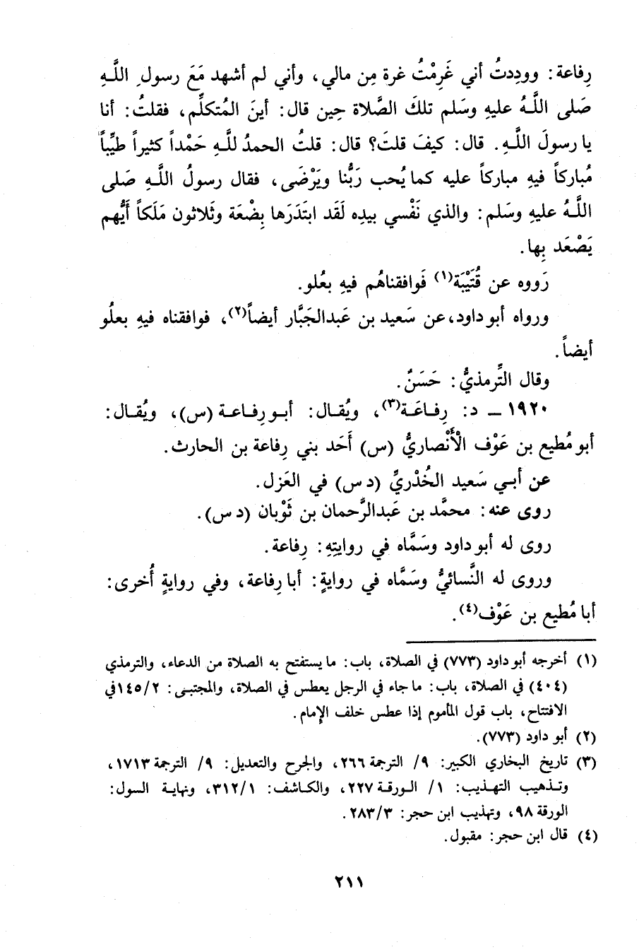 رِفَاعَةُ: ووَدَدْتُ أَنِّي غَرِمْتُ غُرَّةً مِنْ مَالِي، وأَنِّي لَمْ أَشْهَدْ مَعَ رَسُولِ اللَّهِ صَلَّى اللَّهُ عَلَيْهِ وسَلَّمَ تِلْكَ الصَّلاةَ حِينَ قال: أَيْنَ الْمُتَكَلِّمُ، فَقُلْتُ: أَنَا يَا رَسُولَ اللَّهِ. قال: كَيْفَ قُلْتَ؟ قال: قُلْتُ الْحَمْدُ للهِ حَمْدًا كَثِيرًا طَيِّبًا مُبَارَكًا فِيهِ مُبَارَكًا عَلَيْهِ كَمَا يُحِبُّ رَبُّنَا ويَرْضَى، فَقَالَ رَسُولُ اللَّهِ صَلَّى اللَّهُ عَلَيْهِ وسَلَّمَ: والَّذِي نَفْسِي بِيَدِهِ لَقَدِ ابْتَدَرَهَا بِضْعَةٌ وثَلاثُونَ مَلَكًا أَيُّهُمْ يَصْعَدُ بِهَا.