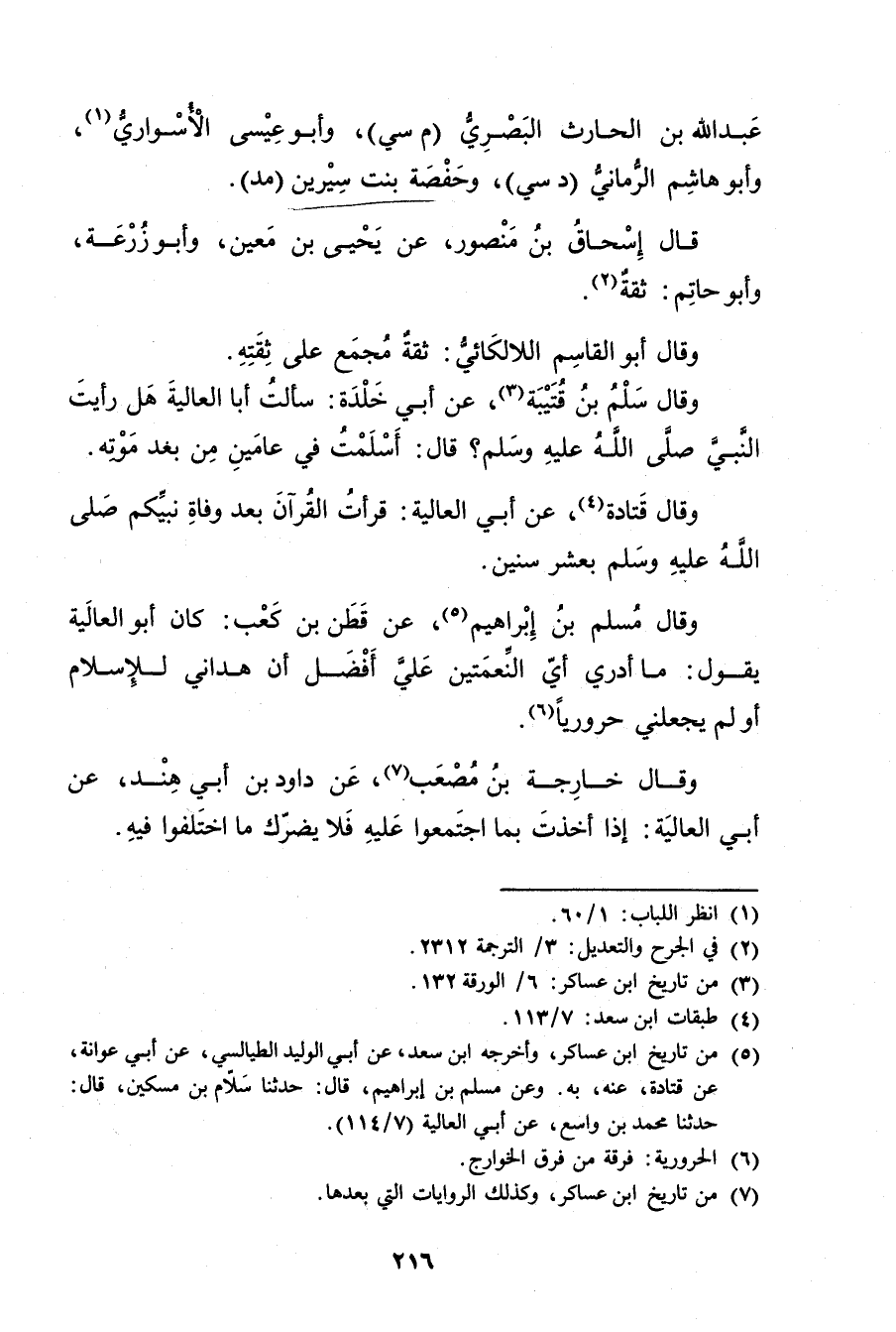 (5) من تاريخ ابن عساكر، وأخرجه ابن سَعْد، عَن أبي الوليد الطيالسي، عَن أبي عوانة، عن قتادة، عنه، به. وعن مُسْلِمُ بْنُ إِبْرَاهِيمَ، قال: حَدَّثَنَا سَلامُ بْنُ مِسْكِينٍ، قال: حَدَّثَنَا محمد بن واسع، عَن أبي العالية (7 / 114) .