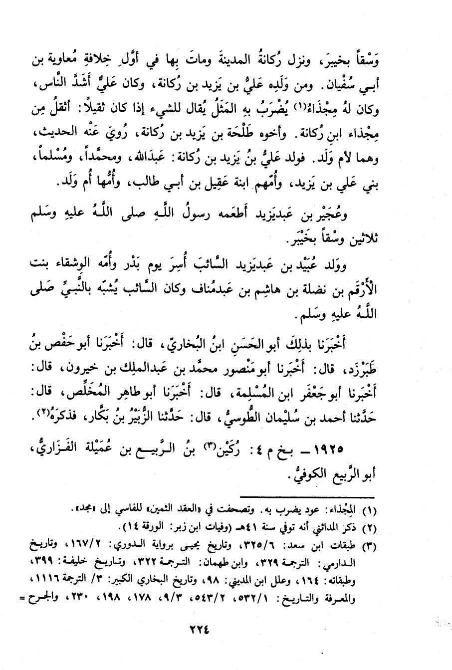 وسقا بخيبر، ونزل ركانة المدينة ومات بها في أول خلافة معاوية بْن أَبي سفيان. ومن ولده علي بْن يزيد بْن ركانة، وكان علي أشد الناس، وكان له مجذاء (1) يضرب به المثل يقال للشئ إذا كان ثقيلا: أثقل من مجذاء ابن ركانة. وأخوه طلحة بْن يزيد بْن ركانة، روي عنه الحديث، وهما لأُم ولد. فولد علي بْن يزيد بْن ركانة: عَبد الله، ومحمداً، ومسلما، بْني علي بْن يزيد، وأمهم ابْنة عقيل بْن أَبي طالب، وأمها أم ولد.