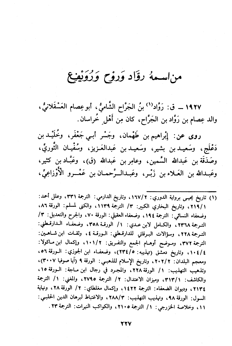 1927 - ق: رواد بن الجراح الشامي (1) ، أبو عصام العسقلاني، والد عصام بْن رواد بْن الجراح، كان من أهل خراسان.