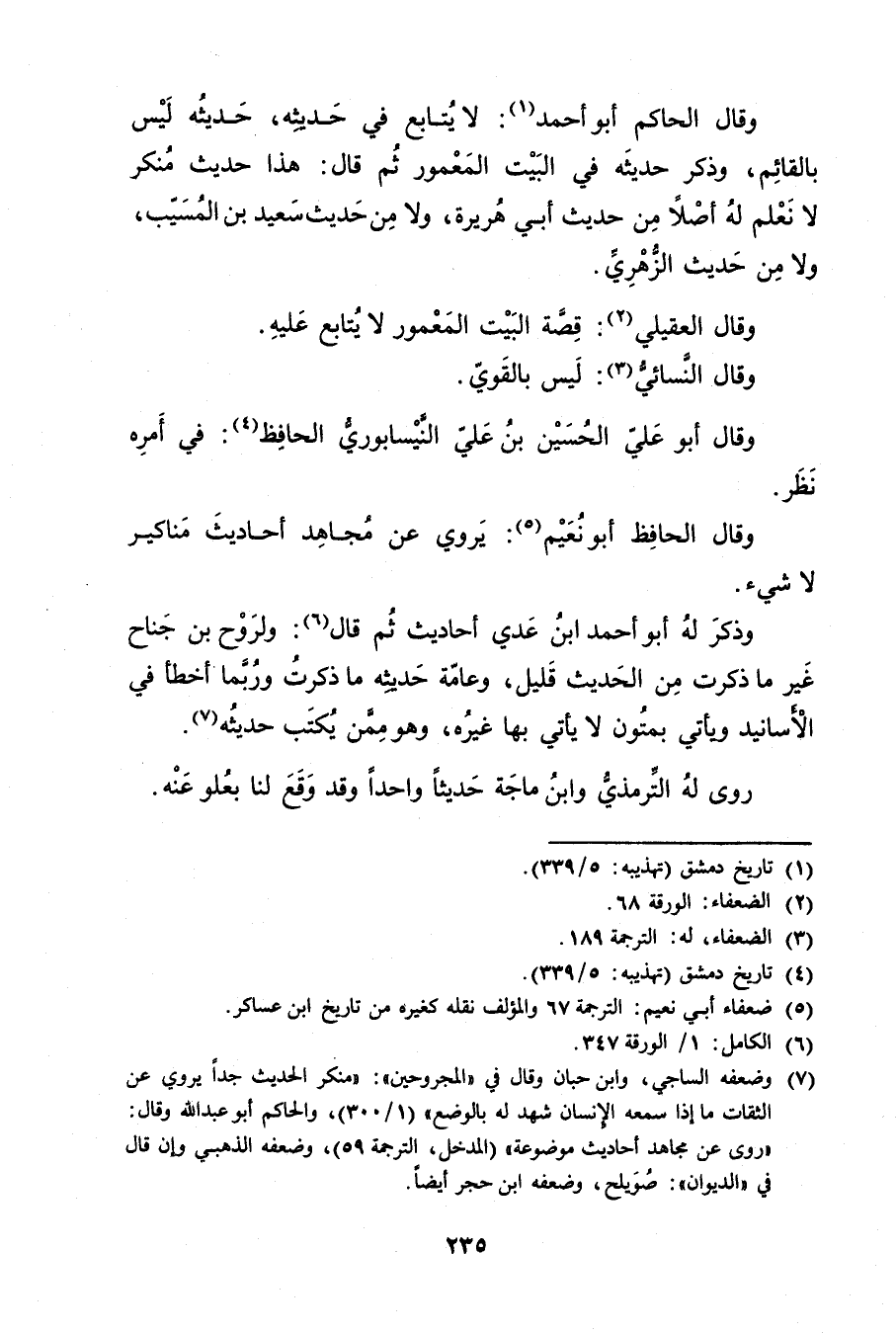 (7) وضعفه الساجي، وابن حبان وَقَال في "المجروحين": منكر الحديث جدا يروي عن الثقات ما إذا سمعه الانسان شهد له بالوضع" (1 / 300) ، والحاكم أَبُو عَبْد اللَّهِ وَقَال: روى عن مجاهد أحاديث موضوعة" (المدخل، الترجمة 59) ، وضعفه الذهبي وإن قال في "الديوان": صويلح، وضعفه ابن حجر أَيْضًا.