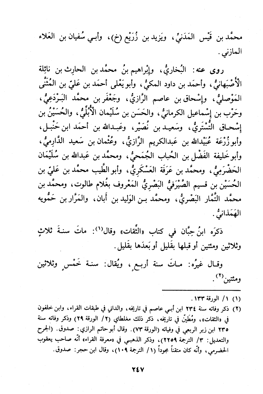 (2) ذكر وفاته سنة 234 ابن أَبي عاصم في تاريخه، والداني في طبقات القراء، وابن خلفون في "الثقات"، ومطين في تاريخه، ذكر ذلك مغلطاي (2 / الورقة 29) وذكر وفاته سنة 235 ابن زبر الربعي في وفياته (الورقة 73) . وَقَال أَبُو حاتم الرازي: صدوق. (الجرح والتعديل: 3 / الترجمة 2259) ، وذكر الذهبي في "معرفة القراء"أنه صاحب يعقوب الحضرمي، وأنه كان متقنا مجودا (1 / الترجمة 109) ، وَقَال ابن حجر: صدوق.