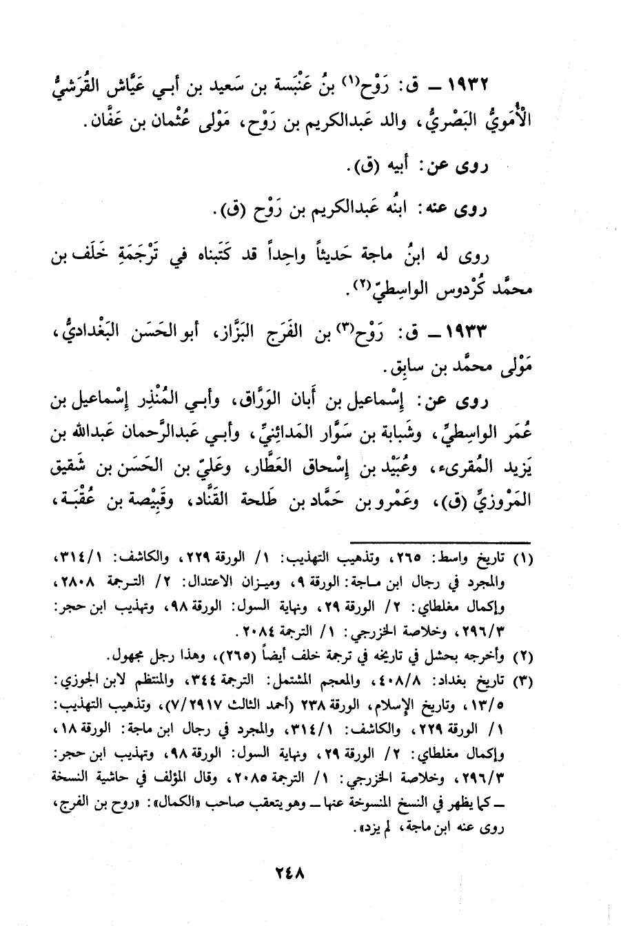 (3) تاريخ بغداد: 8 / 408، والمعجم المشتمل: الترجمة 344، والمنتظم لابن الجوزي: 5 / 13، وتاريخ الاسلام، الورقة 238 (أحمد الثالث 2917 / 7) ، وتذهيب التهذيب: 1 / الورقة 229، والكاشف: 1 / 314، والمجرد في رجال ابن ماجة: الورقة 18، وإكمال مغلطاي: 2 / الورقة 29، ونهاية السول: الورقة 98، وتهذيب ابن حجر: 3 / 296، وخلاصة الخزرجي: 1 / الترجمة 2085، وَقَال المؤلف في حاشية النسخة - كما تظهر في النسخ المنسوخة عنها - وهو يتعقب صاحب "الكمال": روح بن الفرج، روى عنه ابن ماجة، لم يزد".