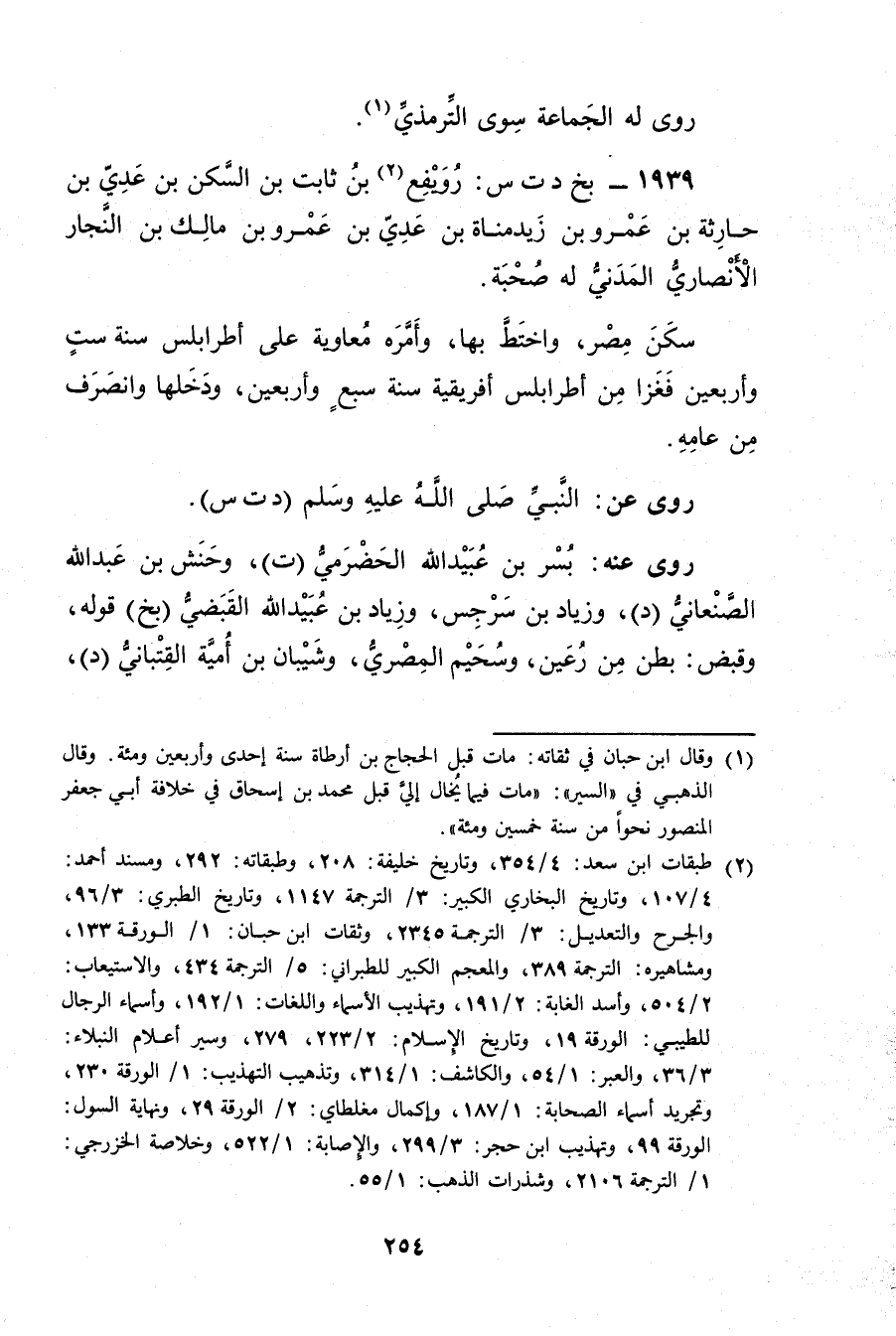 1939 - بخ د ت س: رويفع بن ثابت بن السكن بن عدي بن حارثة بن عَمْرو بن زيدمناة بن عدي بن عَمْرو بن مالك بن النجار الأَنْصارِيّ المدني له صحبة (2) .
