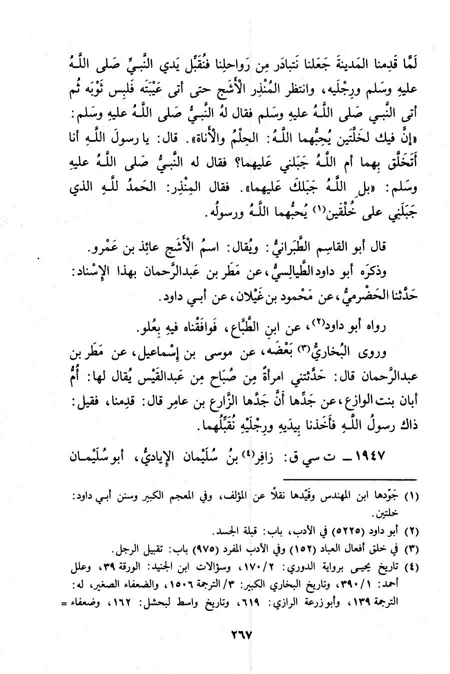 ورَوَى الْبُخَارِيُّ (3) بَعْضَهُ، عَنْ مُوسَى بْنِ إِسْمَاعِيلَ، عَنْ مَطَرِ بْنِ عَبْدِ الرَّحْمَنِ قال: حَدَّثَتْنِي امْرَأَةٌ مِنْ صباح من عبد القيس يُقَالُ لَهَا: أُمُّ أَبَانَ بِنْتُ الْوَازِعِ، عَنْ جَدِّهَا أَنَّ جَدَّهَا الزَّارِعُ بْنُ عَامِرٍ قال: قَدِمْنَا، فَقِيلَ: ذَاكَ رَسُولُ اللَّهِ فَأَخَذْنَا بِيَدَيْهِ ورِجْلَيْهِ نُقَبِّلْهُمَا.