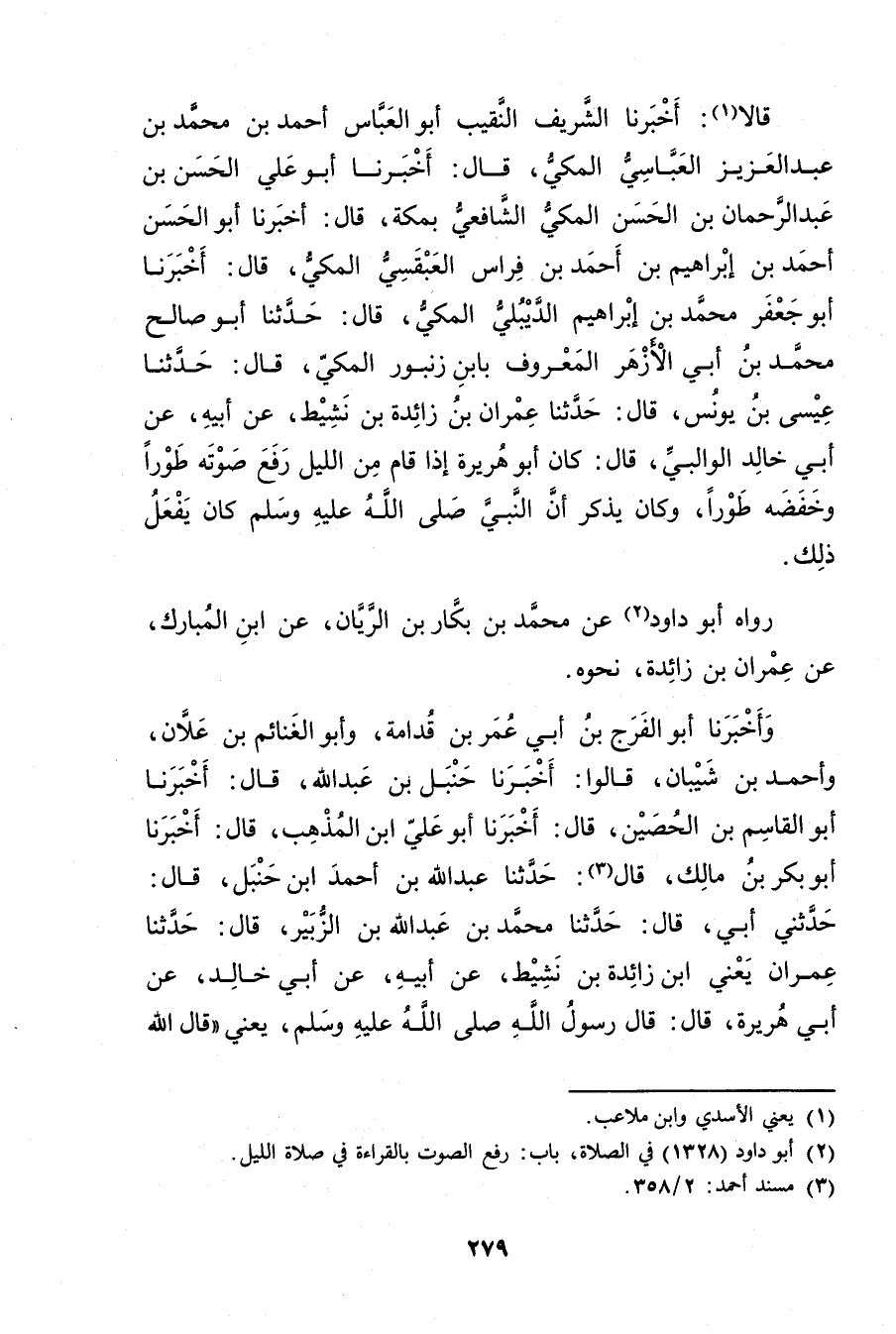 قَالا (1) : أخبرنا الشَّرِيفُ النَّقِيبُ أَبُو الْعَبَّاس أَحْمَد بْن مُحَمَّد بْن عَبْد العزيز العباسي المكي، قال: أَخْبَرَنَا أَبُو عَلِيٍّ الْحَسَنُ بْنُ عَبْدِ الرَّحْمَنِ بْنِ الْحَسَنِ الْمَكِّيُّ الشَّافِعِيُّ بِمَكَّةَ، قال: أخبرنا أَبُو الْحَسَن أَحْمَد بْن إِبْرَاهِيم بْن أَحْمَدَ بْنِ فِرَاسٍ الْعَبْقَسِيُّ الْمَكِّيُّ، قال: أخبرنا أَبُو جَعْفَرٍ مُحَمَّدُ بْنُ إِبْرَاهِيمَ الدَّيْبَلِيُّ الْمَكِّيُّ، قال: حَدَّثَنَا أَبُو صَالِحٍ مُحَمَّدُ بْنُ أَبي الأَزْهَرِ الْمَعْرُوفِ بِابْنِ زَنْبُورٍ الْمَكِّيُّ، قال: حَدَّثَنَا عِيسَى بْنُ يُونُسَ، قال: حَدَّثَنَا عِمْران بْنُ زَائِدَةَ بْنِ نَشِيطٍ، عَن أَبِيهِ، عَن أَبِي خَالِدٍ الْوَالِبِيِّ، قال: كَانَ أَبُو هُرَيْرة إِذَا قَامَ مِنَ اللَّيْلِ رَفَعَ صَوْتَهُ طَوْرًا وخَفَضَهُ طَوْرًا، وكَانَ يَذْكُرُ أَنَّ النَّبِيُّ صلى الله عليه وسلم كَانَ يَفْعَلُ ذَلِكَ.