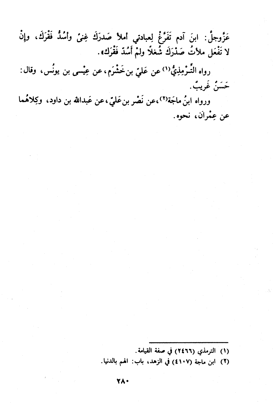 عزوجل: ابْنُ أدَمَ تَفَرَّغْ لِعِبَادَتِي أَمْلأُ صَدْرَكَ غِنًى وأَسُدُّ فَقْرَكَ، وإِنْ لا تَفْعَلْ مَلأْتُ صَدْرَكَ شُغْلا ولَمْ أَسُدُّ فَقْرَكَ.