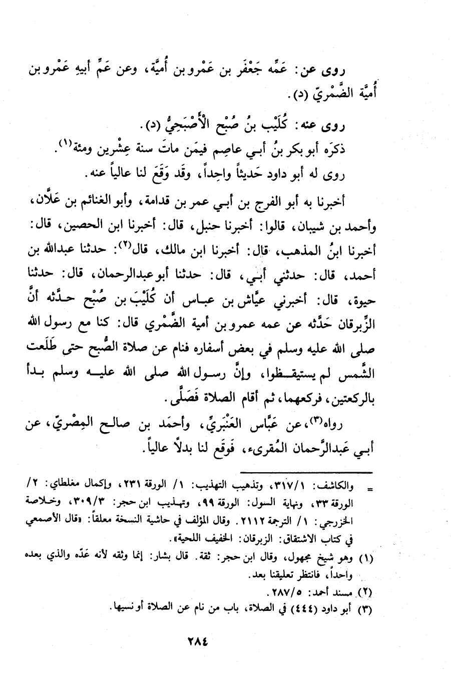 أَخْبَرَنَا بِهِ أبو الفرج بن أَبي شيبان، قَالُوا: أخبرنا حنبل، قال: أخبرنا ابن الحصين، قال: أخبرنا ابْن الْمُذْهِب، قال: أخبرنا ابْن مالك، قال (2) : حَدَّثَنَا عَبد الله بْن أَحْمَدَ، قال: حَدَّثني أبي، قال: حَدَّثَنَا أبو عَبْد الرحمن، قال: حَدَّثَنَا حَيْوَةُ، قال: أَخْبَرَنِي عَيَّاشُ بْنُ عَبَّاسٍ أَنَّ كُلَيْبَ بْنَ صُبْحٍ حَدَّثَهُ أَنَّ الزِّبْرِقَانَ حَدَّثَهُ عَنْ عَمِّهِ عَمْرو بْنِ أُمَيَّةَ الضَّمَرِيِّ قال: كُنَّا مَعَ رَسُول اللَّهِ صلى الله عليه وسَلَّمَ فِي بَعْضِ أَسْفَارِهِ فَنَامَ عَنْ صَلاةِ الصُّبْحِ حَتَّى طَلَعَتِ الشَّمْسُ لَمْ يَسْتَيْقِظُوا، وإِنَّ رَسُولَ اللَّهِ صلى الله عليه وسلم بَدَأَ بِالرَّكْعَتَيْنِ، فَرَكَعَهُمَا، ثُمَّ أَقَامَ الصَّلاةَ فَصَلَّى.