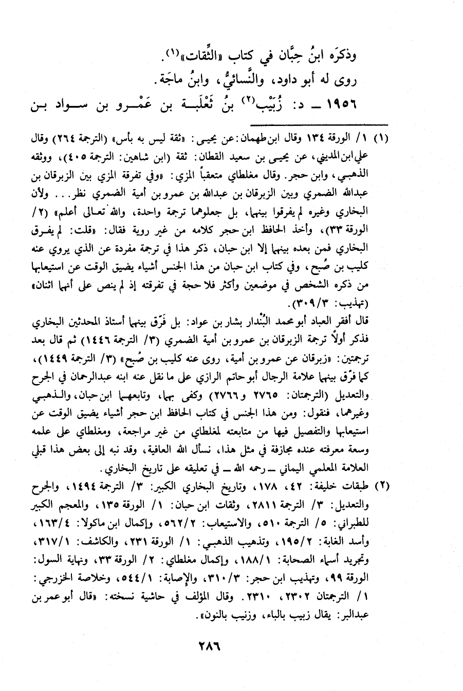 قال أفقر العباد أبو محمد البندار بشار بن عواد: بل فرق بينهما أستاذ المحدثين البخاري فذكر أولا ترجمة الزبرقان بن عَمْرو بن أمية الضمري (3 / الترجمة 1446) ثم قال بعد ترجمتين: زبرقان عن عَمْرو بن أمية، روى عنه كليب بن صبح" (3 / الترجمة 1449) ، كما فرق بينهما علامة الرجال أبو حاتم الرازي على ما نقل عنه ابنه عبد الرحمن في الجرح والتعديل (الترجمتان: 2765 و2766) وكفى بهما، وتابعهما ابن حبان، والذهبي وغيرهما، فنقول: ومن هذا الجنس في كتاب الحافظ ابن حجر أشياء يضيق الوقت عن استيعابها والتفصيل فيها من متابعته لمغلطاي من غير مراجعة، ومغلطاي على علمه وسعة معرفته عنده مجازفة في مثل هذا، نسأل الله العافية، وقد نبه إلى بعض هذا قبلي العلامة المعلمي اليماني - رحمه الله - في تعليقه على تاريخ البخاري.