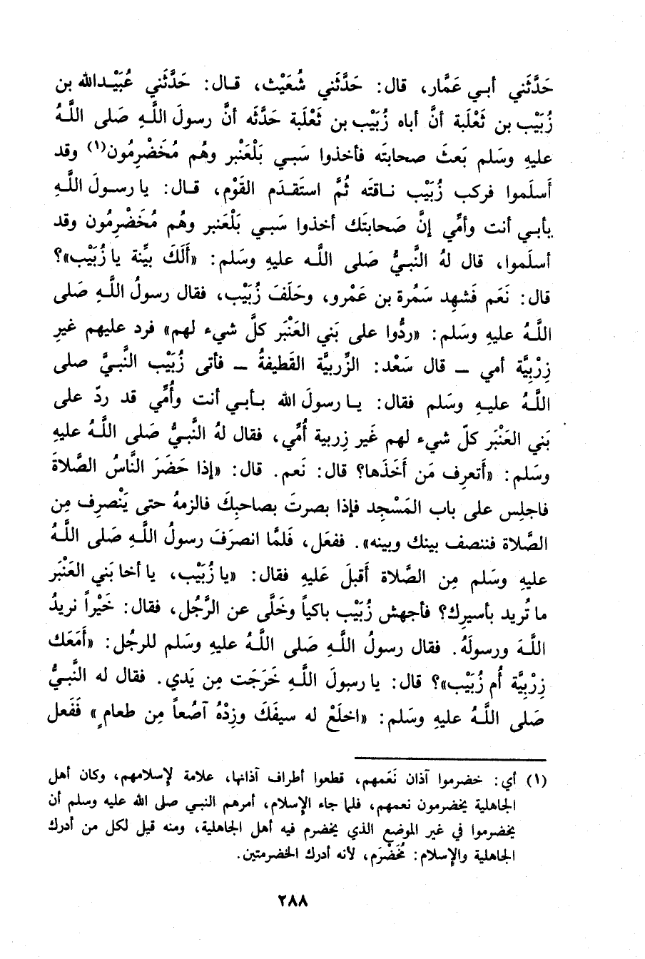 حَدَّثني أَبِي عَمَّارُ، قال: حَدَّثَنِي شُعَيْثُ، قال: حَدَّثَنِي عُبَيد اللَّهِ بْنُ زُبَيْبُ بْنُ ثَعْلَبَةَ أَنَّ أَبَاهُ زُبَيْبُ بْنُ ثَعْلَبَةَ حَدَّثَهُ أن رَسُول اللَّهِ صَلَّى اللَّهُ عَلَيْهِ وسَلَّمَ بَعَثَ صَحَابَتَهُ فَأَخَذُوا سَبْيَ بَلْعَنْبَرٍ وهم مُخَضْرَمُونَ (1) وقَدْ أَسْلَمُوا فَرَكِبَ زُبَيْبٌ نَاقَتَهُ ثُمَّ استقدم القوم، قال: يارسول اللَّهِ بِأَبِي أَنْتَ وأُمِّي إِنَّ صَحَابَتَكَ أَخَذُوا سَبْيَ بَلْعَنْبَرٍ وهم مُخَضْرَمُونَ وقَدْ أَسْلَمُوا، قال لَهُ النَّبِيُّ صلى الله عليه وسلم: أَلَكَ بَيِّنَةٌ يَا زُبَيْبُ"؟ قال: نَعَمْ فَشَهِدَ سَمُرَة بْنُ عَمْرو، وحَلَفَ زُبَيْبٌ، فَقَالَ رَسُولُ اللَّهِ صَلَّى اللَّهُ عَلَيْهِ وسَلَّمَ: رُدُّوا عَلَى بَنِي الْعَنْبَرِ كُلَّ شَيْءٍ لَهُمْ"فَرَدَّ عَلَيْهِمْ غَيْرَ زِرْبِيَّةِ أُمِّي، قال سَعْدٌ: الزِّرْبِيَّةُ الْقَطِيفَةُ - فَأَتَى زُبَيْبٌ النَّبِيِّ صَلَّى اللَّهُ عليه وسلم فقال: يارسول اللَّهِ بِأَبِي أَنْتَ وأُمِّي قَدْ رَدَّ عَلَيَّ بَنِي الْعَنْبَرِ كُلَّ شَيْءٍ لَهُمْ غَيْرَ زِرْبِيَّةِ أُمِّي، فَقَالَ لَهُ النَّبِيُّ صَلَّى اللَّهُ عَلَيْهِ وسَلَّمَ: أَتَعْرِفُ مَنْ أَخَذَهَا؟ قال: نَعَمْ. قال: إِذَا حَضَرَ النَّاسُ الصَّلاةَ فَاجْلِسْ عَلَى بَابِ الْمَسْجِدِ فَإِذَا بَصُرْتَ بِصَاحِبِكَ فَالْزَمْهُ حتى ينصرف من الصلاة فنصف بَيْنَكَ وبَيْنَهُ". فَفَعَلَ، فَلَمَّا انْصَرَفَ رَسُول اللَّهِ صلى الله عليه وسَلَّمَ مِنَ الصَّلاةِ أَقْبَلَ عَلَيْهِ فَقَالَ: يَا زُبَيْبُ، يَا أَخَا بَنِي الْعَنْبَرِ مَا تُرِيدُ بُأَسِيرِكَ؟ فَأَجْهَشَ زُبَيْبُ بَاكِيًا وخَلَّى عَنِ الرَّجُلِ، فَقَالَ: خَيْرًا نُرِيدُ اللَّهَ ورَسُولَهُ. فَقَالَ رَسُولُ اللَّهِ صلى اللَّهُ عَلَيْهِ وسَلَّمَ لِلرَّجُلِ: أَمَعَكَ زربية أم زبيب"؟ قال: يارسول اللَّهِ خَرَجَتْ مِنْ يَدِي.