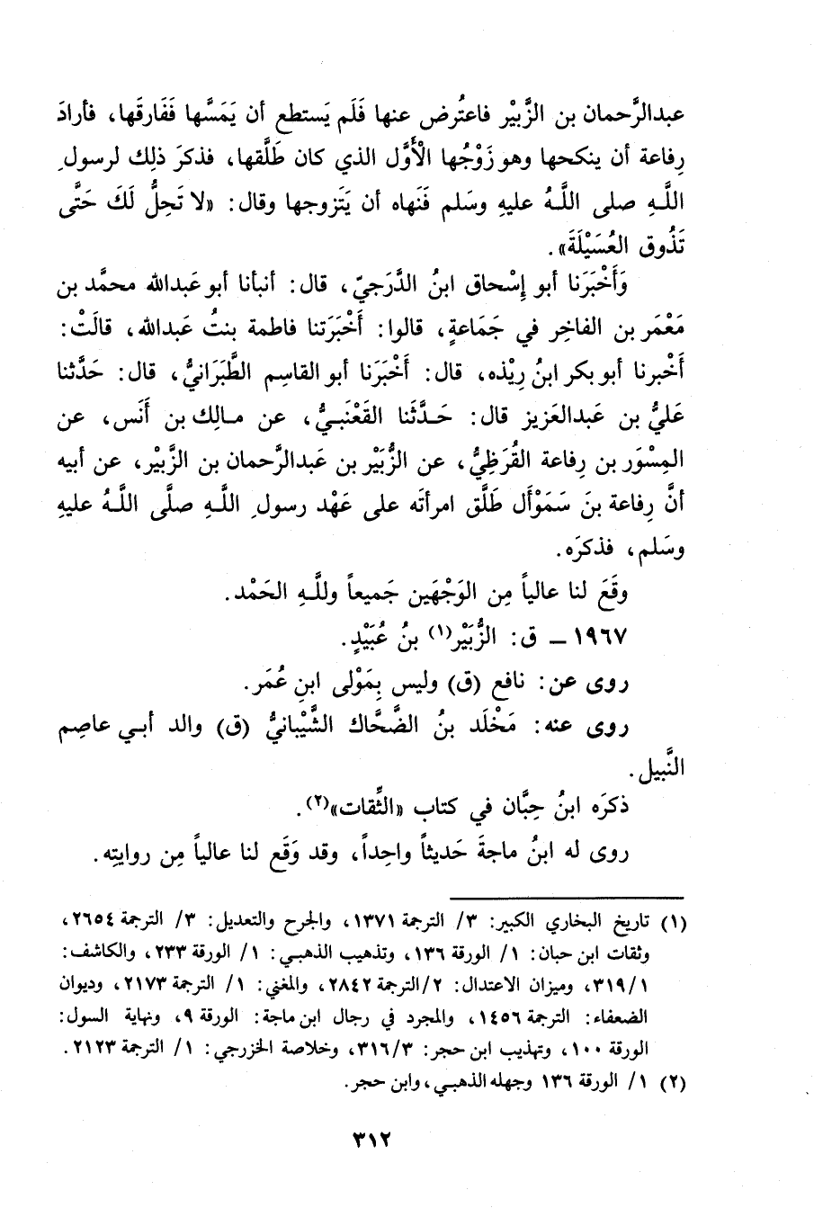 عَبْدُ الرَّحْمَنُ بْنُ الزُّبَيْرِ فَاعْتَرَضَ عَنْهَا فَلَمْ يَسْتَطِعْ أَنْ يَمَسَّهَا فَفَارَقَهَا، فَأَرَادَ رِفَاعَةُ أَنْ يَنْكِحَهَا وهُوَ زَوْجُهَا الأَوَّلُ الَّذِي كَانَ طَلَّقَهَا، فَذَكَرَ ذَلِكَ لِرَسُولِ اللَّهِ صَلَّى اللَّهُ عَلَيْهِ وسَلَّمَ فَنَهَاهُ أَنْ يَتَزَوَّجَهَا وَقَال: لا تَحِلُّ لَكَ حَتَّى