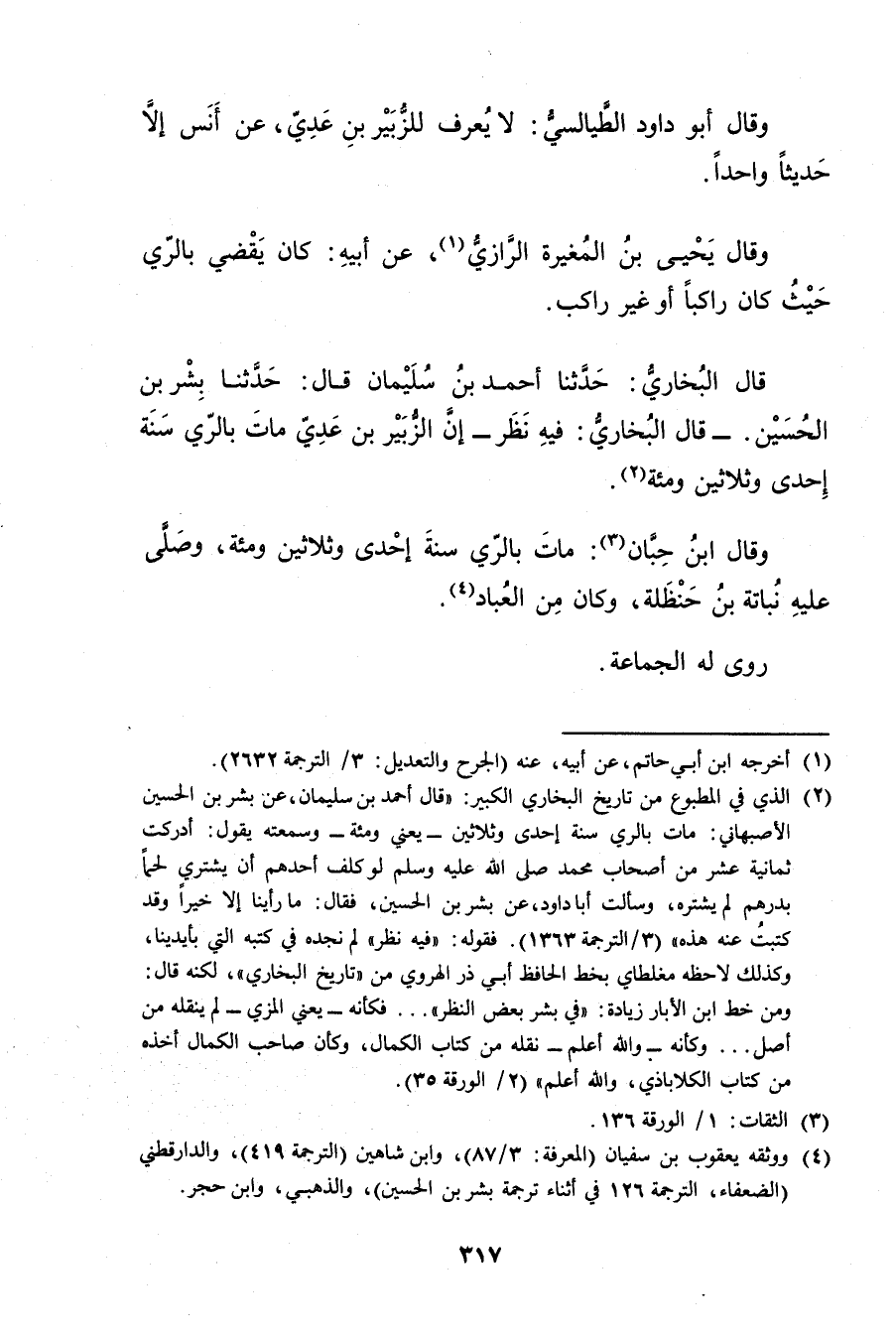 - قال البخاري: فيه نظر - أن الزبير بْن عدي مات بالري سنة إحدى وثلاثين ومئة (2) .