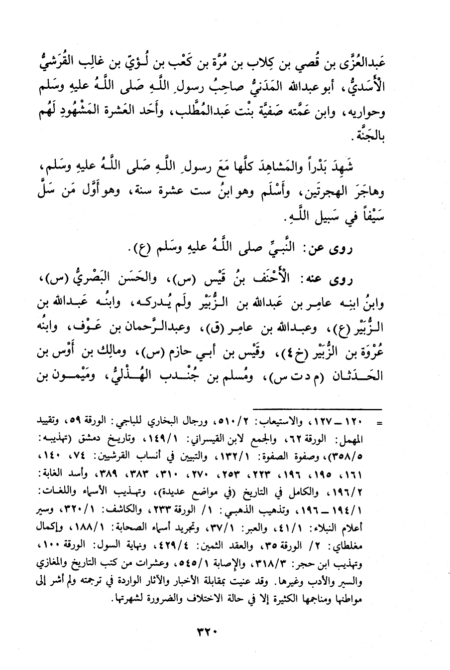 = 120 - 127، والاستيعاب: 2 / 510، ورجال البخاري للباجي: الورقة 59، وتقييد المهمل: الورقة 62، والجمع لابن القيسراني: 1 / 149، وتاريخ دمشق (تهذيبه: 5 / 358) ، وصفوة الصفوة: 1 / 132، والتبيين في أنساب القرشيين: 74، 140، 161، 195، 196، 223، 253، 270، 310، 383، 389، وأسد الغابة: 2 / 196، والكامل في التاريخ (في مواضع عديدة) ، وتهذيب الأَسماء واللغات: 1 / 194 - 196، وتذهيب الذهبي: 1 / الورقة 233، والكاشف: 1 / 320، وسير أعلام النبلاء: 1 / 41، والعبر: 1 / 37، وتجريد أسماء الصحابة: 1 / 188، وإكمال مغلطاي: 2 / الورقة 35، والعقد الثمين: 4 / 429، ونهاية السول: الورقة 100، وتهذيب ابن حجر: 3 / 318، والاصابة 1 / 545، وعشرات من كتب التاريخ والمغازي والسير والادب وغيرها. وقد عنيت بمقابلة الاخبار والآثار الواردة في ترجمته ولم أشر إلى مواطنها ومناجمها الكثيرة إلا في حالة الاختلاف والضرورة لشهرتها.