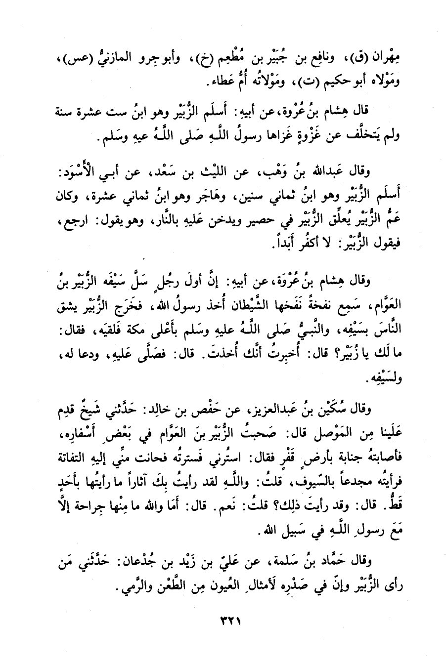 وَقَال سكين بْن عبد العزيز، عن حفص بْن خالد: حَدَّثَنِي شيخ قدم علينا من الموصل قال: صحبت الزبير بْن العوام في بعض أسفاره، فأصابته جنابة بأرض قفر فقال: استرني فسترته فحانت مني إليه التفاته فرأيته مجدعا بالسيوف، قلت: والله لقد رأيت بك أثارا ما رأيتها بأحد قط. قال: وقد رأيت ذلك؟ قلت: نعم. قال: أما والله ما منها جراحة إلا مع رسول الله في سبيل الله.