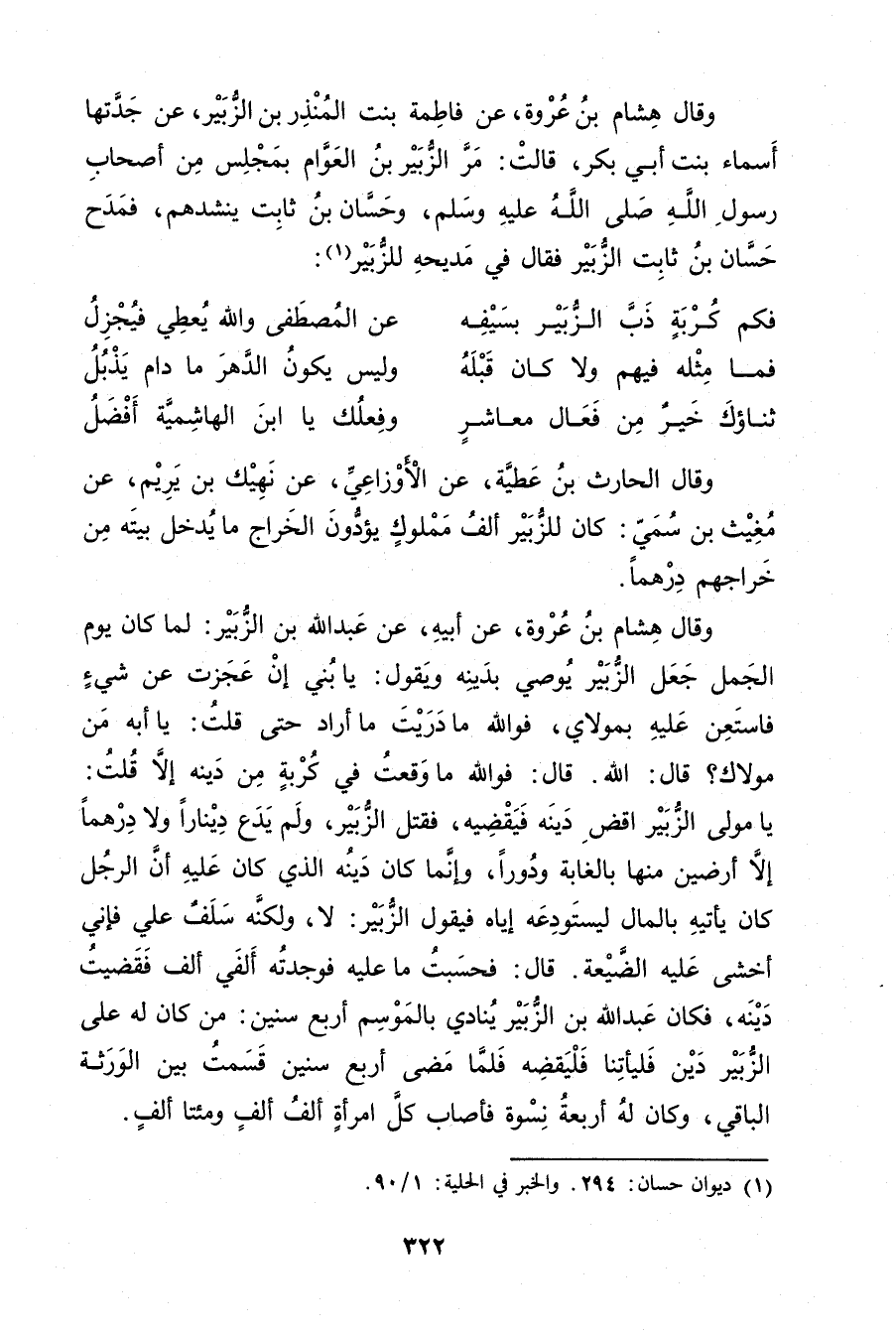 وَقَال هِشَامُ بْنُ عُرْوَةَ، عَنْ فاطمة بْنت المنذر بْن الزبير، عن جدتها أسماء بْنت أبي بكر، قالت: مر الزبير بْن العوام بمجلس من أصحاب رسول اللَّهِ صلى الله عليه وسلم، وحسان بْن ثابت ينشدهم، فمدح حسان بْن ثابت الزبير فقال في مديحة للزبير (1) :