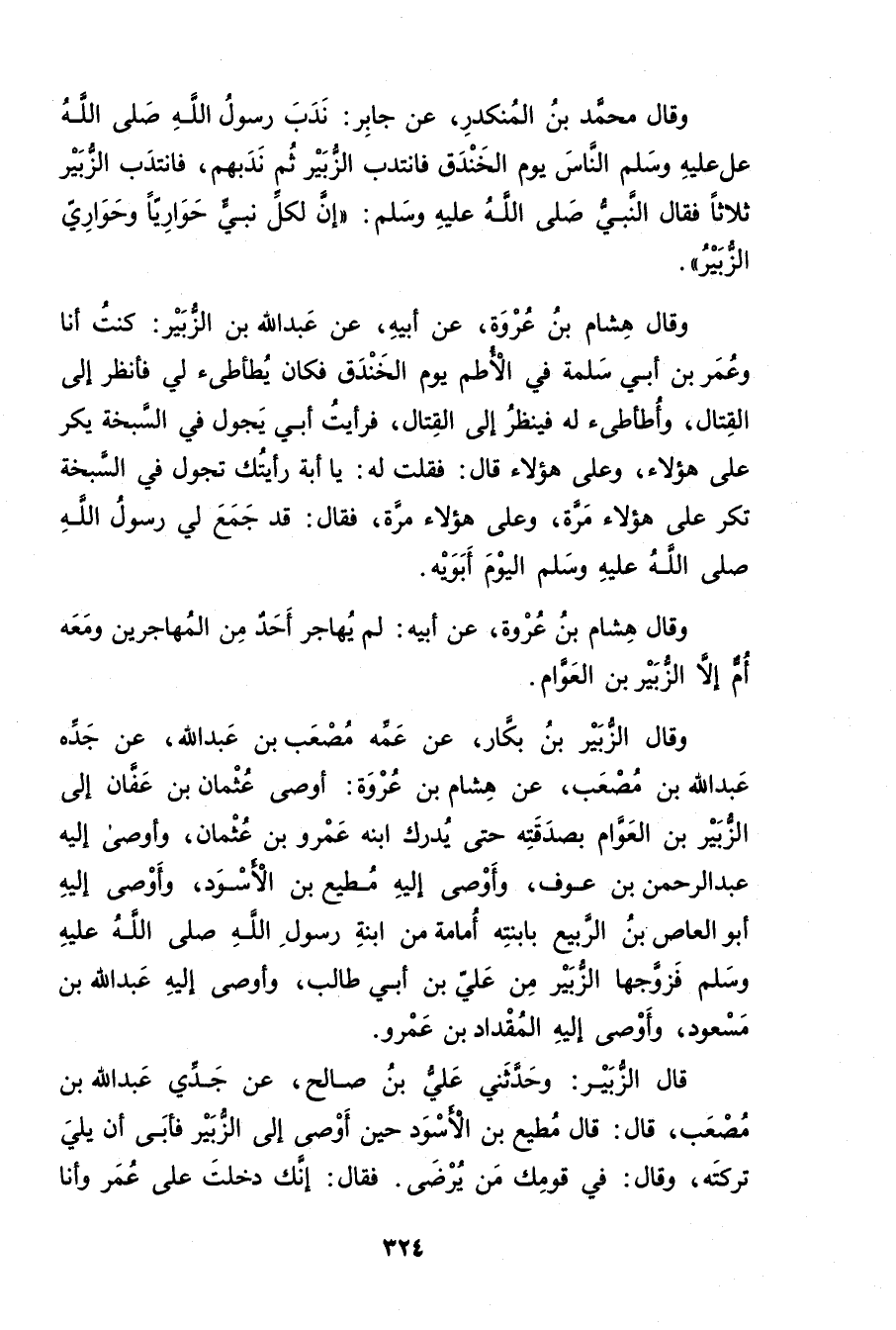 وَقَال الزبير بْن بكار، عن عمه مصعب بن عَبد اللَّهِ، عن جده عَبد الله بْن مصعب، عن هشام بْن عروة: أوصى عثمان بْن عفان إلى الزبير بْن العوام بصدقته حتى يدرك ابْنه عَمْرو بْن عثمان، وأوصى إليه عَبد الرحمن بْن عوف، وأوصى إليه مطيع بْن الأسود، وأوصى إليه أبو العاص بْن الربيع بابْنته أمامة من ابْنة رَسُول اللَّهِ صلى الله عليه وسلم فزوجها الزبير من علي بْن أَبي طالب، وأوصى إليه عَبد الله بْن مسعود، وأوصى إليه المقداد بْن عَمْرو.