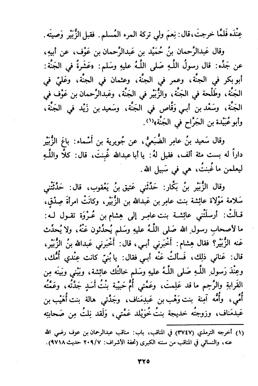 وَقَال عَبْدُ الرَّحْمَنِ بْن حميد بْن عَبْد الرحمن بْنِ عَوْفٍ، عَن أَبِيهِ، عَنْ جَدِّهِ: قال رَسُولُ اللَّهِ صَلَّى اللَّهُ عَلَيْهِ وسَلَّمَ: عَشْرَةٍ فِي الْجَنَّةِ: أَبُو بَكْرٍ فِي الْجَنَّةِ، وعُمَر فِي الْجَنَّةِ، وعُثْمَانُ فِي الْجَنَّةِ، وعَلِيٌّ فِي الْجَنَّةِ، وطَلْحَةُ فِي الْجَنَّةِ، والزُّبَيْرُ فِي الْجَنَّةِ، وعَبْدُ الرَّحْمَنِ بْنُ عَوْفٍ فِي الْجَنَّةِ، وسَعْدُ بْنُ أَبي وقَّاصٍ فِي الْجَنَّةِ، وسَعِيد بْنُ زَيْدٍ فِي الْجَنَّةِ، وأَبُو عُبَيدة بْنِ الْجَرَّاحِ فِي الْجَنَّةِ" (1) .