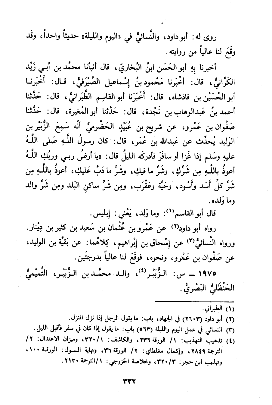 أخبرنا به أَبُو الْحَسَنِ بْنُ الْبُخَارِيِّ، قال أَنْبَأَنَا مُحَمَّدُ بْنُ أَبي زَيْدٍ الْكَرَّانِيُّ، قال: أَخْبَرَنَا مَحْمُودُ بْنُ إِسْمَاعِيلَ الصَّيْرَفِيُّ، قال: أخبرنا أَبُو الحسين بْن فَاذْشْاهِ، قال: أخبرنا أَبُو الْقَاسِمِ الطَّبَرَانِيُّ، قال: حَدَّثَنَا أَحْمَدُ بْنُ عَبْدِ الْوَهَّابِ بْنِ نَجْدَةَ، قال: حَدَّثَنَا أَبُو المغيرة، قال: حَدَّثَنَا صَفْوَانُ بْنُ عَمْرو، عَنْ شُرَيْحِ بْنِ عُبَيد الْحَضْرَمِيِّ أَنَّهُ سَمِعَ الزُّبَيْرَ بْنَ الْوَلِيدِ يُحَدِّثُ عَنْ عَبد اللَّهِ بْن عُمَر، قال: كان رَسُول اللَّهِ صَلَّى اللَّهُ عَلَيْهِ وسَلَّمَ إِذَا غَزَا أَوْ سَافَرَ فَأَدْرَكَهُ اللَّيْلُ قال: يَا أَرْضُ رَبِّي ورَبُّكِ اللَّهُ أَعُوذُ بِاللَّهِ مِنْ شَرِّكِ، وشَرِّ مَا فِيكِ، وشَرِّ مَا دَبَّ عَلَيْكِ، أَعُوذُ بِاللَّهِ مِنْ شَرِّ كُلِّ أَسَدٍ وأَسْوَدَ، وحَيَّةٍ وعَقْرَبٍ، ومِنْ شَرِّ سَاكِنِ الْبَلَدِ ومِنْ شَرِّ والِدٍ ومَا ولَدَ.