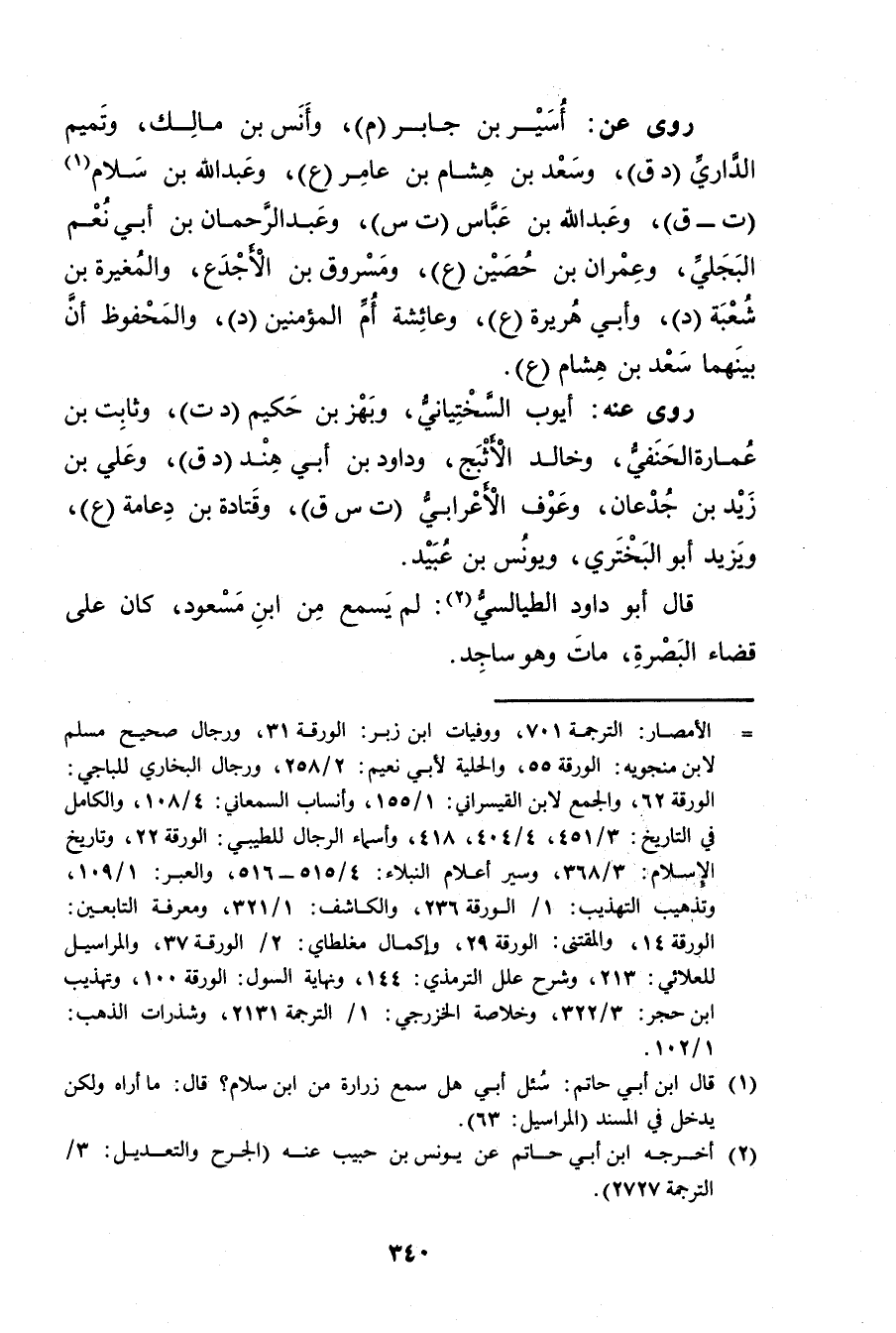 = الامصار: الترجمة 701، ووفيات ابن زبر: الورقة 31، ورجال صحيح مسلم لابن منجويه: الورقة 55، والحلية لابي نعيم: 2 / 258، ورجال البخاري للباجي: الورقة 62، والجمع لابن القيسراني: 1 / 155، وأنساب السمعاني: 4 / 108، والكامل في التاريخ: 3 / 451، 4 / 404، 418، وأسماء الرجال للطيبي: الورقة 22، وتاريخ الاسلام: 3 / 368، وسير أعلام النبلاء: 4 / 515 - 516، والعبر: 1 / 109، وتذهيب التهذيب: 1 / الورقة 236، والكاشف: 1 / 321، ومعرفة التابعين: الورقة 14، والمقتنى: الورقة 29، وإكمال مغلطاي: 2 / الورقة 37، والمراسيل للعلائي: 213، وشرح علل التِّرْمِذِيّ: 144، ونهاية السول: الورقة 100، وتهذيب ابن حجر: 3 / 322، وخلاصة الخزرجي: 1 / الترجمة 2131، وشذرات الذهب: 1 / 102.