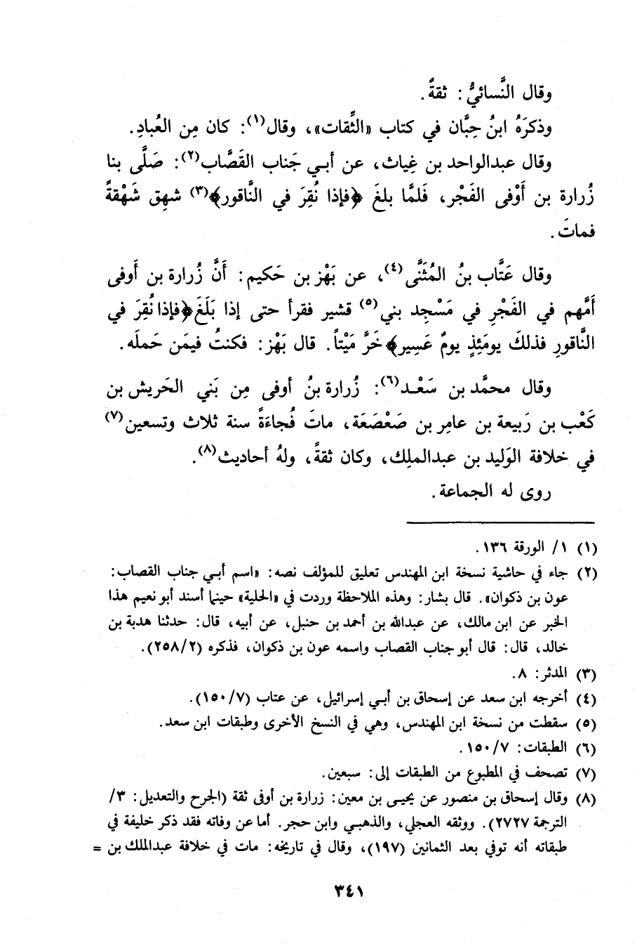 (8) وَقَال إسحاق بْن منصور عَن يحيى بن مَعِين: زرارة بن أوفى ثقة (الجرح والتعديل: 3 / الترجمة 2727) . ووثقه العجلي، والذهبي وابن حجر. أما عن وفاته فقد ذكر خليفة في طبقاته أنه توفي بعد الثمانين (197) ، وَقَال في تاريخه: مات في خلافة عَبد المَلِك بن =