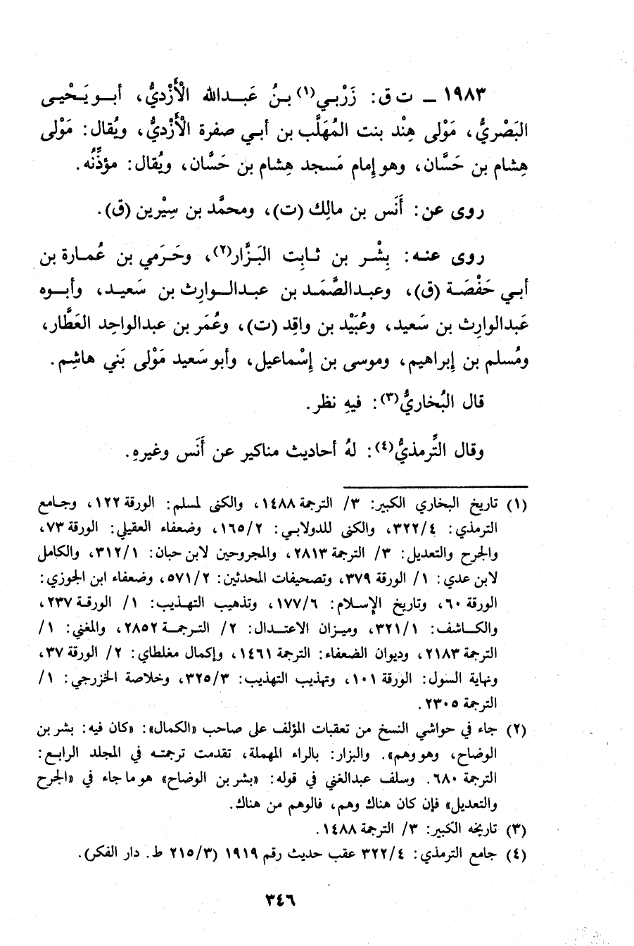 1983 - ت ق: زربي بن عَبد الله الأزدي (1) ، أبويحيى البَصْرِيّ، مولى هند بْنت المهلب بْن أَبي صفرة الأزدي، ويُقال: مولى هشام بْن حسان، وهو إمام مسجد هشام بْن حسان، ويُقال: مؤذنه.
