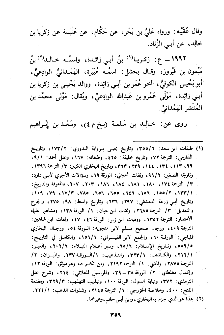 1992 - ع: زكريا بن أَبي زائدة (1) ، واسمه خالد (2) بْن ميمون بْن فيروز، وَقَال بحشل: اسمه هبيرة، الهمداني الوادعي، أبويحيى الكوفي، أخو عُمَر بْن أَبي زائدة، ووالد يحيى بْن زكريا بْن أَبي زائدة، مولى عَمْرو بْن عَبد الله الوادعي، ويُقال: مولى مُحَمَّد بْن المنتشر الهمداني.