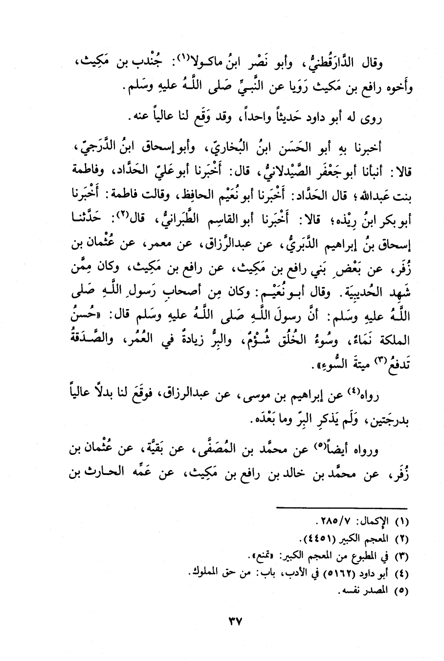 أَخْبَرَنَا بِهِ أَبُو الْحَسَنِ بن البخاري، وأبو إسحاق ابن الدَّرَجِيِّ، قَالا: أَنْبَأَنَا أَبُو جَعْفَرٍ الصيدلاني، قال: أخبرنا أبوعلي الْحَدَّادُ، وفَاطِمَةُ بِنْتُ عَبد اللَّهِ، قال الْحَدَّادُ: أخبرنا أَبُو نُعَيْمٍ الْحَافِظُ، وَقَالت فَاطِمَةُ: أخبرنا أَبُو بَكْرِ بْنُ رِيذَةَ، قَالا: أخبرنا أَبُو الْقَاسِمِ الطَّبَرَانِيُّ، قال (2) : حَدَّثَنَا إِسْحَاقُ بْنُ إِبْرَاهِيمَ الدَّبَرِيُّ، عَنْ عَبْد الرَّزَّاقِ، عَنْ مَعْمَر، عَنِ عُثْمَانَ بْنِ زُفَرَ، عَنْ بَعْضِ بْني رافع بْن مكيث، عن رَافِعِ بْنِ مَكِيثَ، وكَانَ مِمَّنْ شَهِدَ الْحُدَيْبِيَةَ.