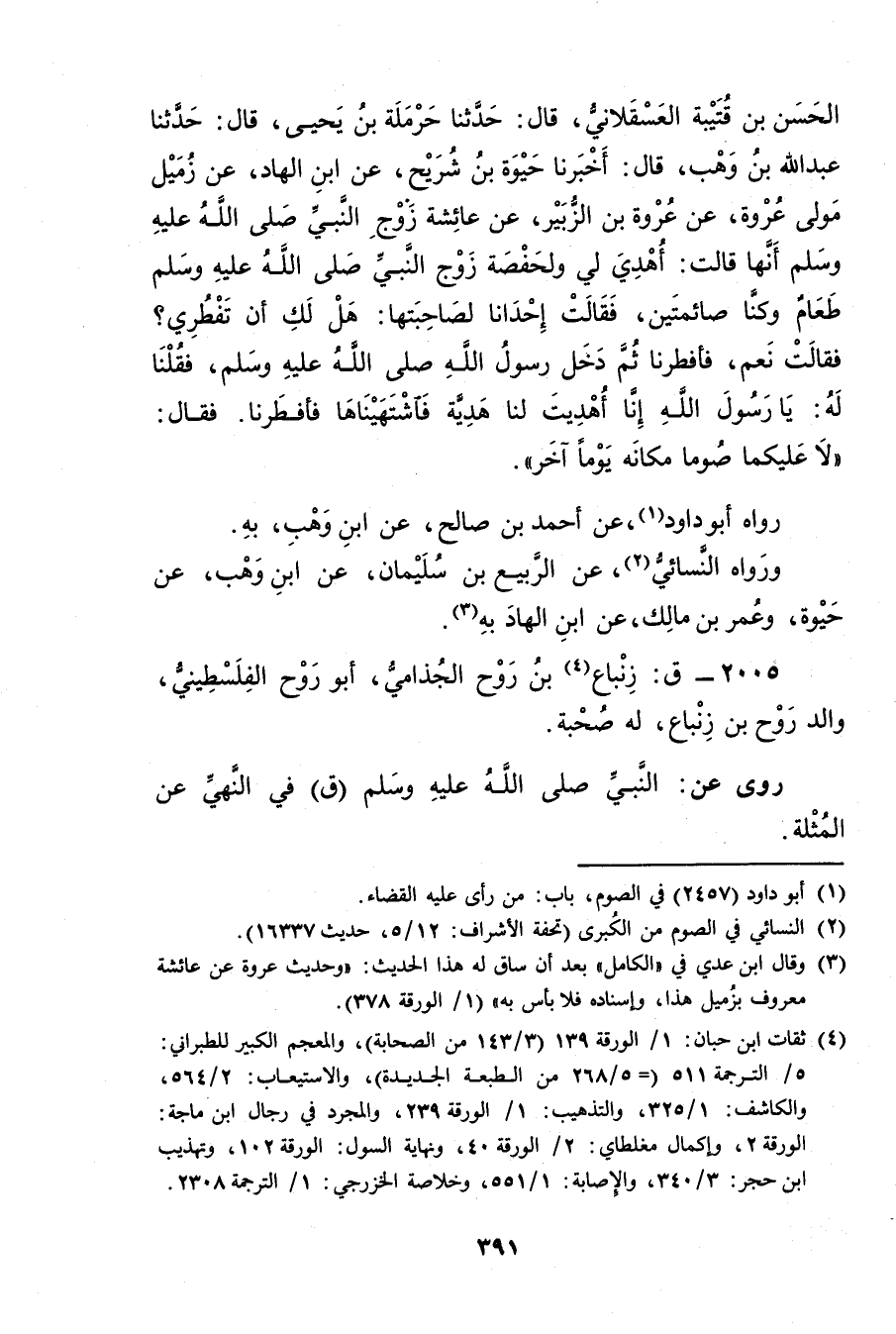 الحسن بْن قتيبة العسقلاني، قال: حَدَّثَنَا حَرْمَلَةُ بْنُ يَحْيَى، قال: حَدَّثَنَا عَبد اللَّهِ بْن وهب، قال: أخبرنا حَيْوَةُ بْنُ شُرَيْحٍ، عَنِ ابْنِ الْهَادِ، عَنْ زُمَيْلٍ مَوْلَى عُرْوَةَ، عَنْ عُرْوَةَ بْنِ الزُّبَيْرِ، عَنْ عَائِشَةَ زَوْجِ النَّبِيِّ صَلَّى اللَّهُ عَلَيْهِ وسَلَّمَ أَنَّهَا قَالَتْ: أُهْدِيَ لِي ولِحَفْصَةَ زَوْجِ النَّبِيُّ صلى الله عليه وسلم طَعَامٌ وكُنَّا صَائِمَتَيْنً، فَقَالَتْ إِحْدَانَا لِصَاحِبَتِهَا: هَلْ لَكِ أَنْ تُفْطِرِي؟ فقالت نَعَمْ، فَأَفْطَرْنَا ثُمَّ دَخَلَ رَسُولُ اللَّهِ صلى الله عليه وسلم، فَقُلْنَا لَهُ: يَا رَسُولَ اللَّهِ إِنَّا أَهْدِيَتْ لَنَا هَدِيَّةٌ فَاشْتَهَيْنَاهَا فَأَفْطَرْنَا. فَقَالَ: لا عَلَيْكُمَا صُومَا مَكَانَهُ يَومًا أخَرَ.